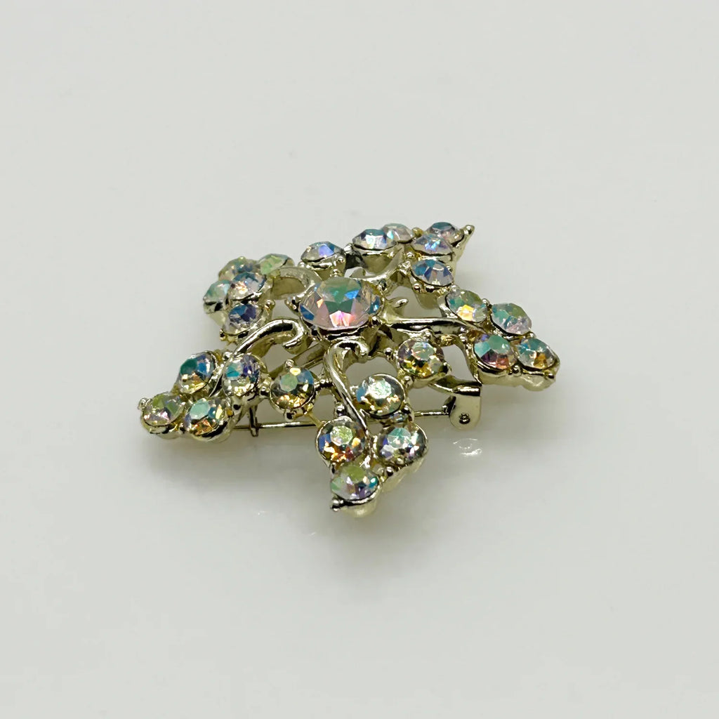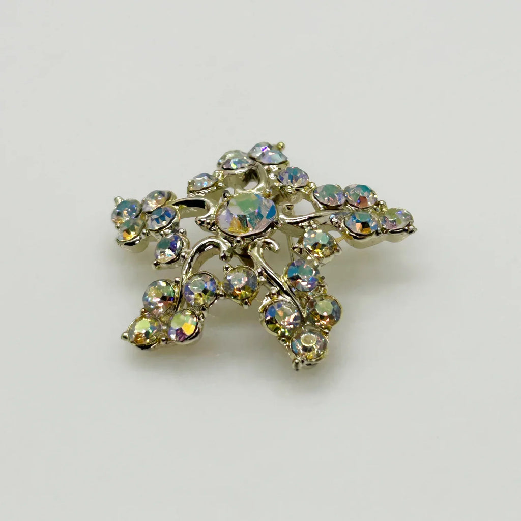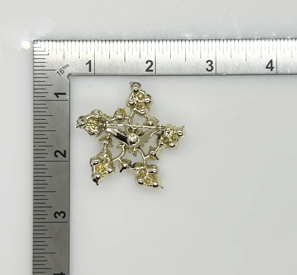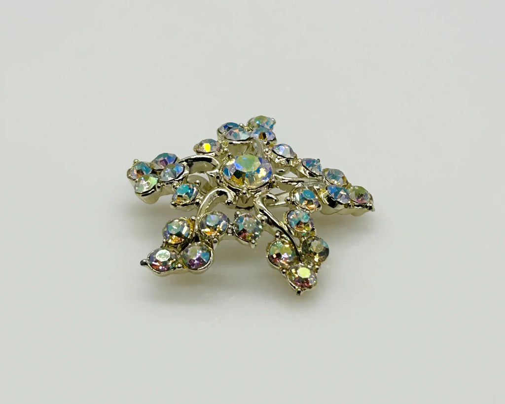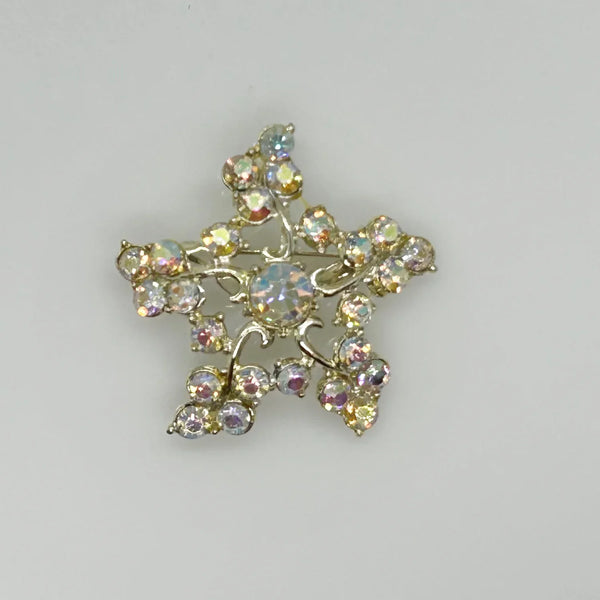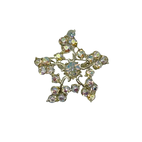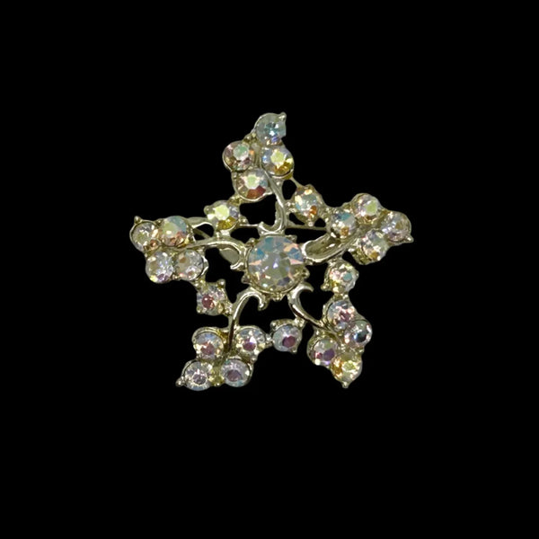 Here is a bright vintage gold star brooch, with sparkling golden rhinestones with an aurora borealis cast to them, set in gold tone metal. It is very similar to a grey brooch elsewhere in the store. They are both almost identical to the one I won from my grandmother playing "go fish" many decades ago. It measures 1 3/4" tall, and is in excellent condition.