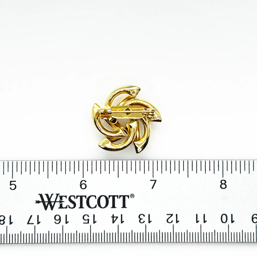 Spin into vintage style with this charming gold scatter pin! Featuring a dynamic swirl design with gracefully curved spokes, this mid-century modern beauty boasts impressive weight and a lustrous finish that catches the light beautifully. At just 1" across, it's the perfect petite accessory to elevate scarves, hats, lapels, or anywhere your creativity takes you. A timeless piece from the golden era of 1960s-80s fashion jewelry that deserves a spot in your collection.