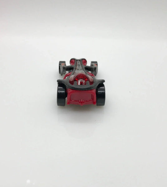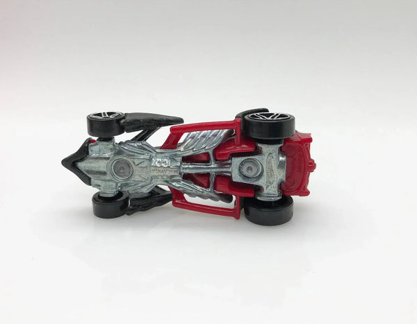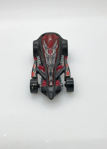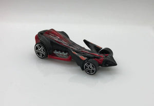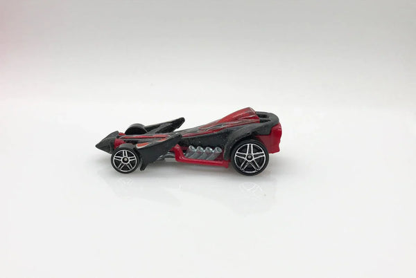 Street Beasts II; flat black with silver and red graphics; red interior with red tinted windows; PR5 wheels, made in Malaysia. It was designed by Rob Matthes; 1:64 scale.