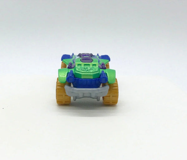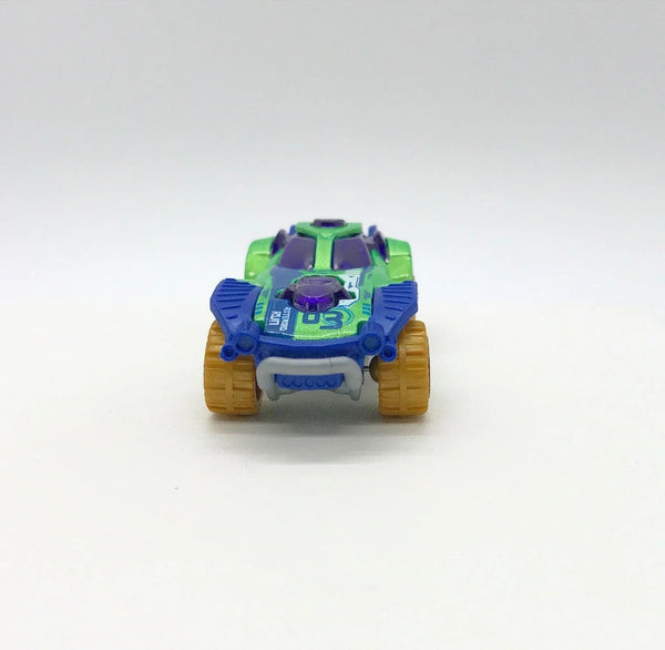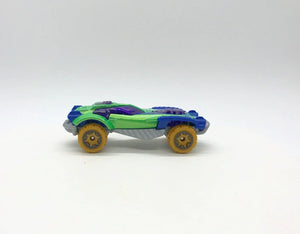 Hot Wheels Space, blue with green, "Asteroid Run" 03, tinted purple windows. Gold beadlock off road wheels. Designed by Mark Jones, made in Malaysia, 1:64 scale. FJV82; L43