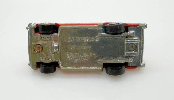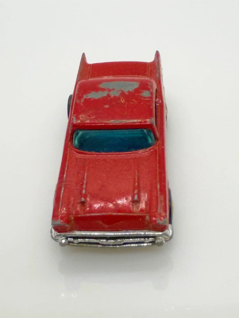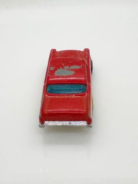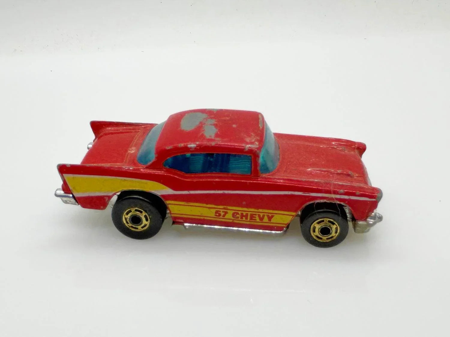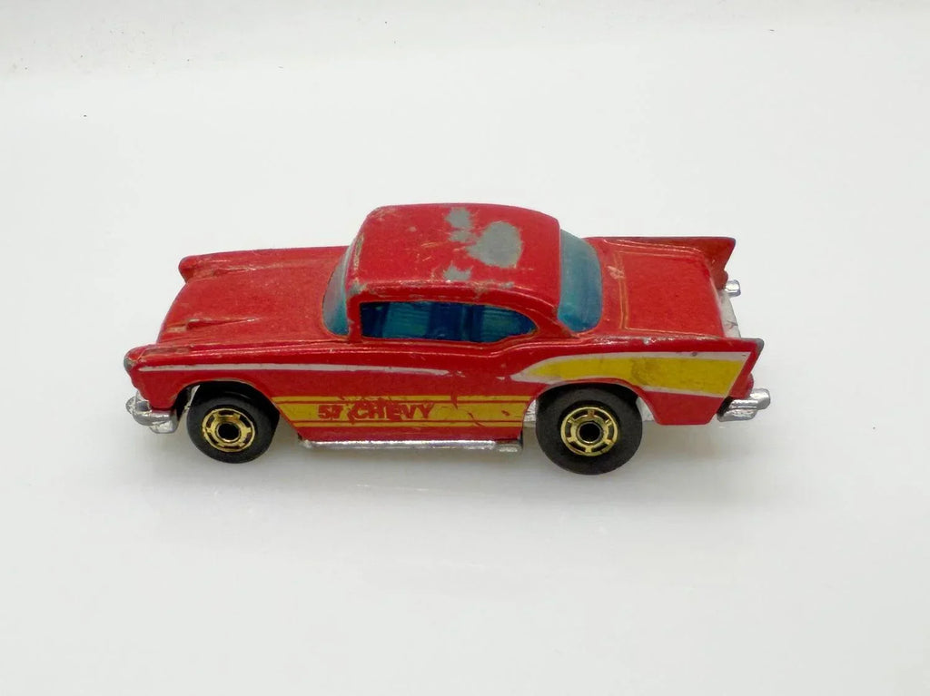 This '57 Chevy is from either the Flying Colors or Mainline series, and is red with yellow and white graphics, closed hood. On the side it reads "57 Chevy". It has blue windows and blue interior; 1:64 scale. The wheels are gold BW (?) and it was made in Hong Kong. Larry Wood design. Has some damage to paint on roof, some wear to paint throughout. Best as a project or filler.