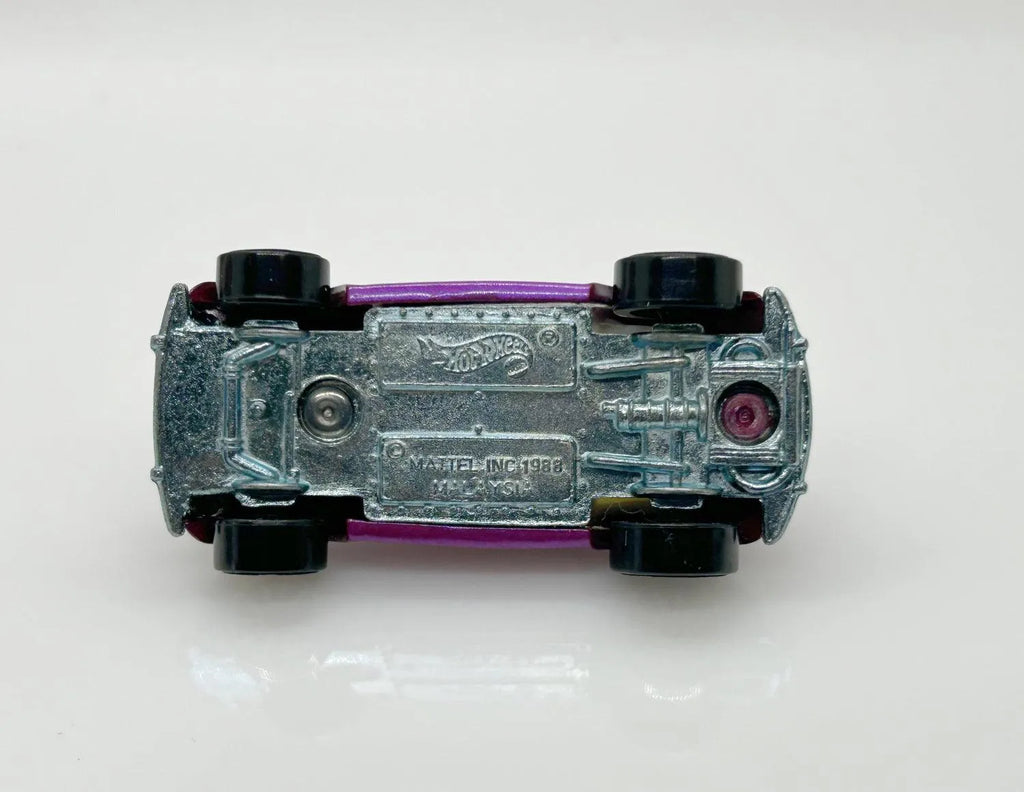 Mystery Cars, in Metalflake (purple) pink, with white interior, and lighter pink flakes. The windshield is clear, and the wheels are chrome 10SP. It was designed by Larry Wood, and made in Malaysia, 1:64 scale.