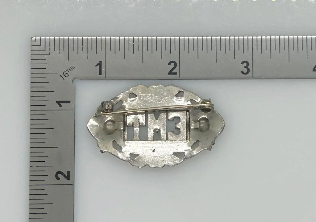 The brooch measures just slightly under 2" across. It is near perfect on the front, on the back there is a miniscule amount of metal loss. A tangible touch to a bygone era.