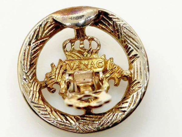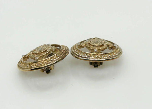These exquisite clip-on earrings from the 1990s signed "Ivana" feature a detailed coat of arms design, framed by an elegant, ornate border. Measuring 1 inch in diameter, they reflect a baroque vintage aesthetic and are preserved in very good condition. Part of Ivana Trump’s distinct retail jewelry collection following her divorce, these earrings showcase her flair for sophisticated accessories that combine heritage motifs with timeless style. Ideal for collectors and those who appreciate unique statement pieces, they offer a touch of historical elegance paired with collectible value.