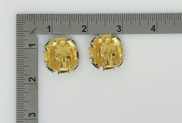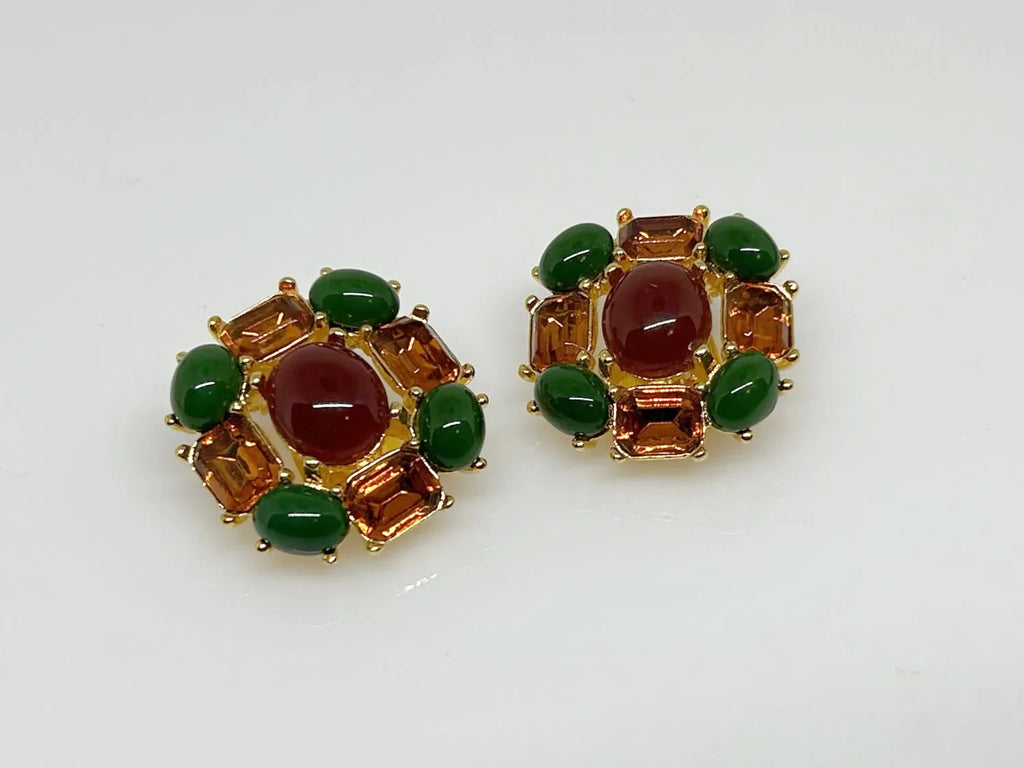 These earrings are well crafted and just gorgeous, great for autumn!. A center cabochon deep amber-red oval stone is surrounded by alternating citrine colored emerald cut rhinestones and green oval cabochons. They measure just over 1” wide and 1” tall; they are hinge back and made in nice weight metal and signed Joan Rivers in a raised oval.