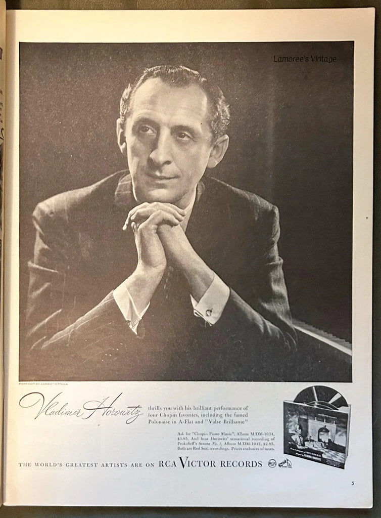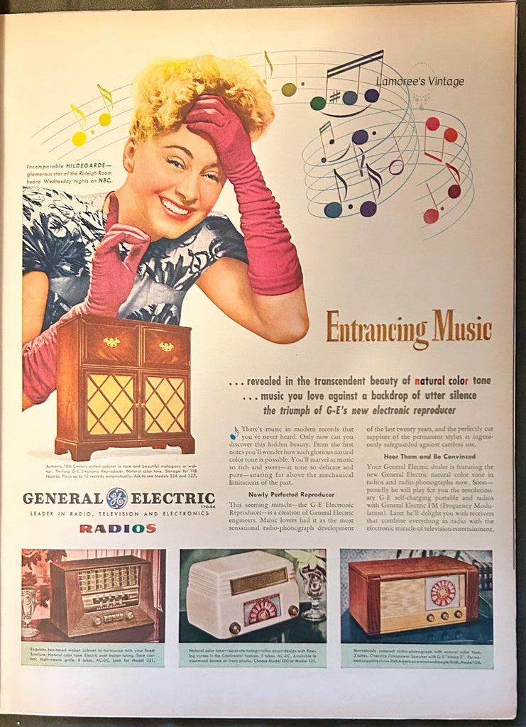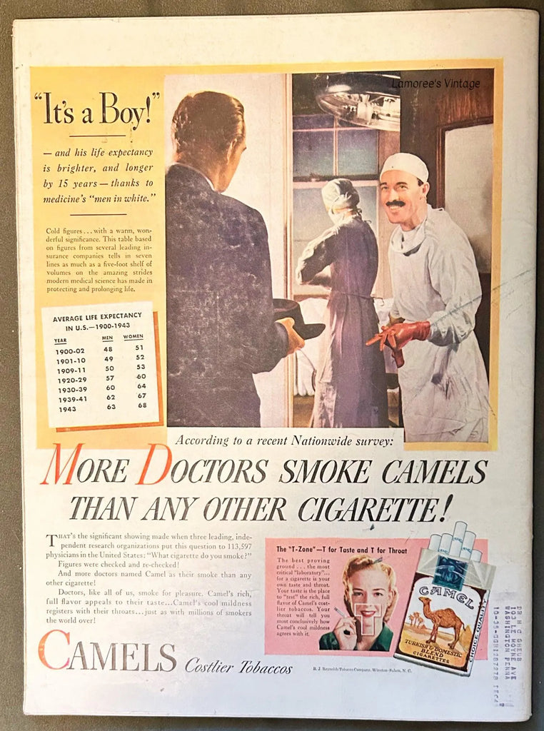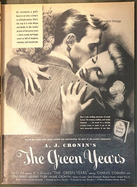 Ads: Hotpoint electric ranges; Van Raatle nylon stocking ad with cute dog; A&P Supermarket Easter ham ad; 7-up soda; radio star Hildegarde promotes General Electric radios; Jell-o; Wyeth Pharmaceuticals ad shows elderly couple ; the western film "Renegades" with Evelyn Keyes; Dorothy Lamour promotes Royal Crown cola; movie "So Goes All My Love" with Myrna Loy and Don Ameche; Royal Stetson Hat ad set at dog show; beautiful art ad for Cutex "Dark n' Handsome" nail polish; "Family Musicale" ad for beer, by Mead Schaffer; actor Alan Ladd endorses Fleers gum and more. 137 pages, small mailing label on back corner.