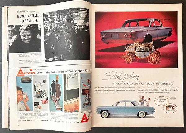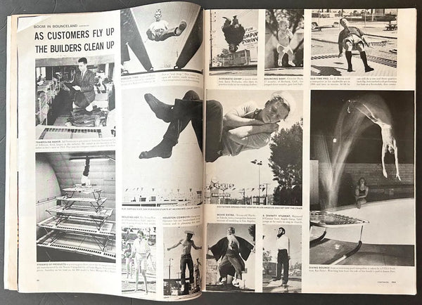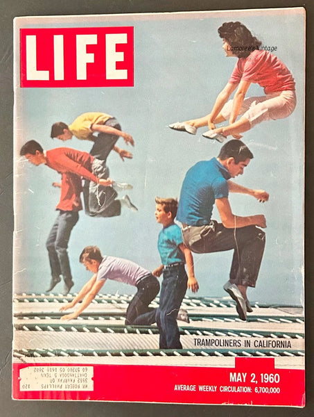 Cover story: Trampoliners; Charles de Gaulle, riots in Korea, Syngman Rhee; Mormonism, horse racing, Groucho Marx in "The Mikado"; labor problems in Britain, burlesque. Ads include Prince Matchabelli cologne, Kellogg's Corn Flakes, Maidenform girdles, and color Friskies dog food ad. Some staining, please see photos. It has 142 pages, small mailing label, some curling on front cover.
