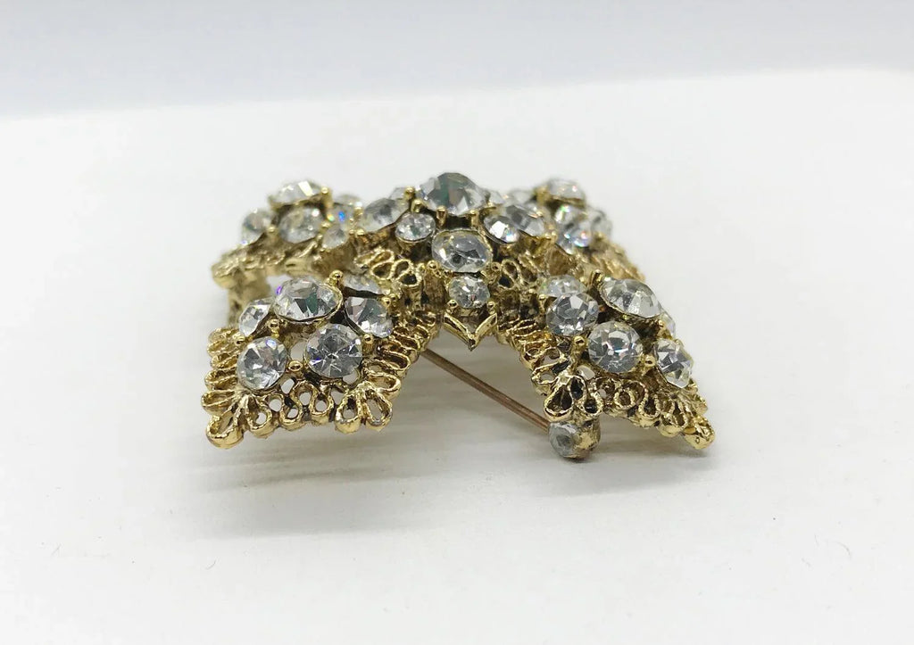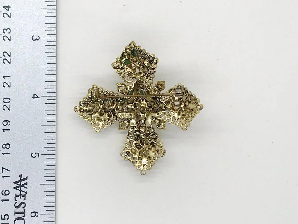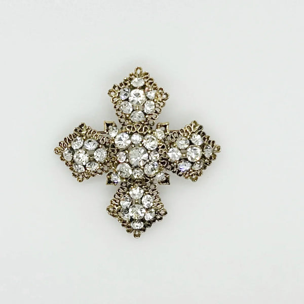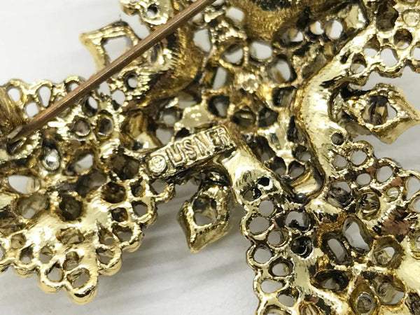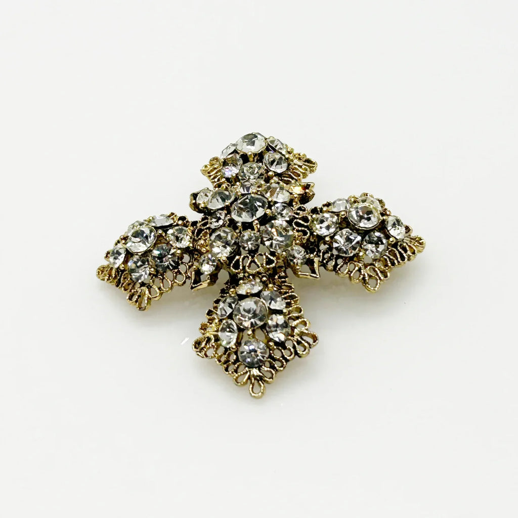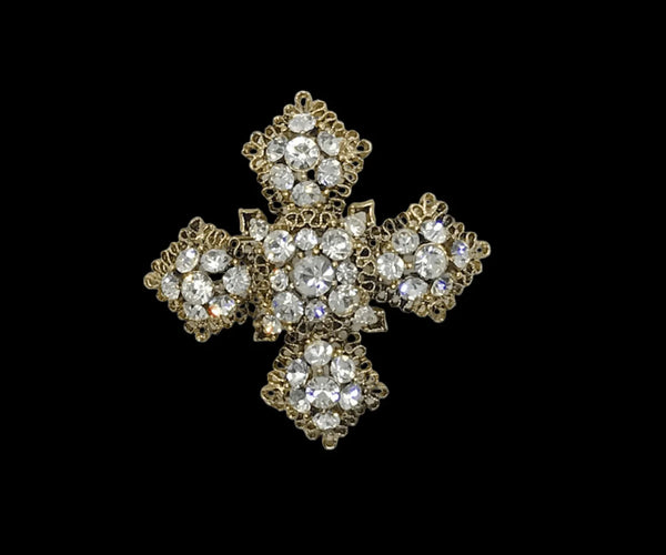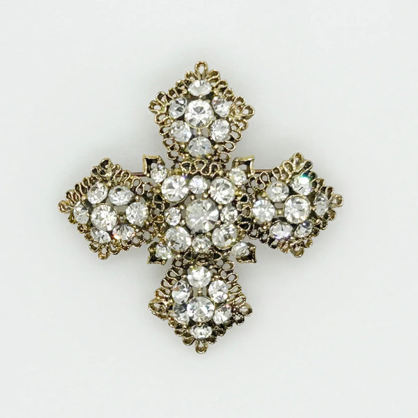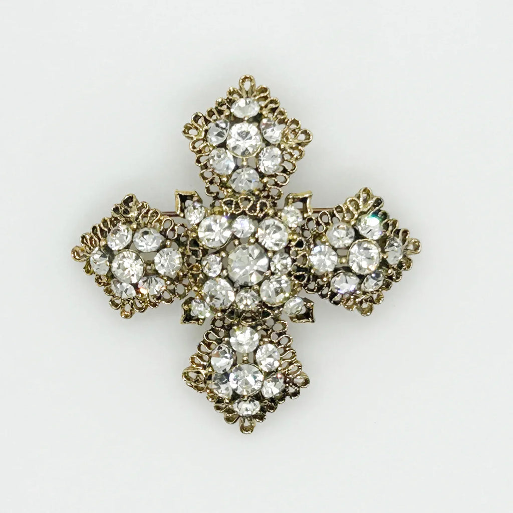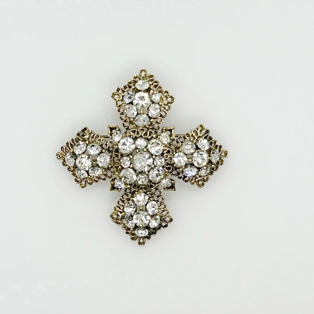 Experience the elegance and beauty of the Lisner Vintage White Rhinestone Cross Brooch. Adorned with a dazzling array of small and medium-sized rhinestones arranged in an intricate ribbon design, this stunning piece is sure to make a statement. Measuring at 2.25", it boasts a slight dome and the iconic Lisner logo in raised block letters on the back. Embodying the timeless charm and sophistication of vintage jewelry, this brooch is a must-have for any collection.