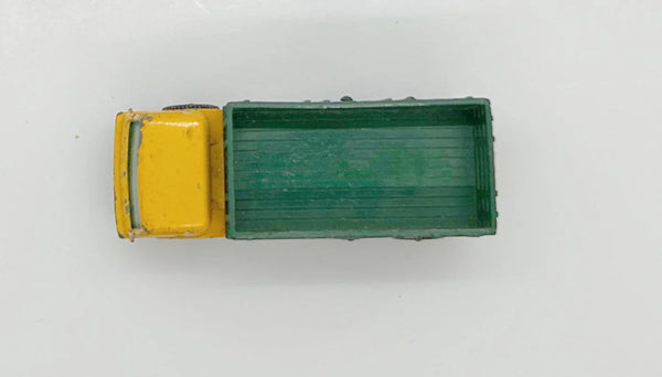 Made in England by Lesney. Yellow-orange cab, green storage area, blue green tinted windows. Some chips, please see photos.