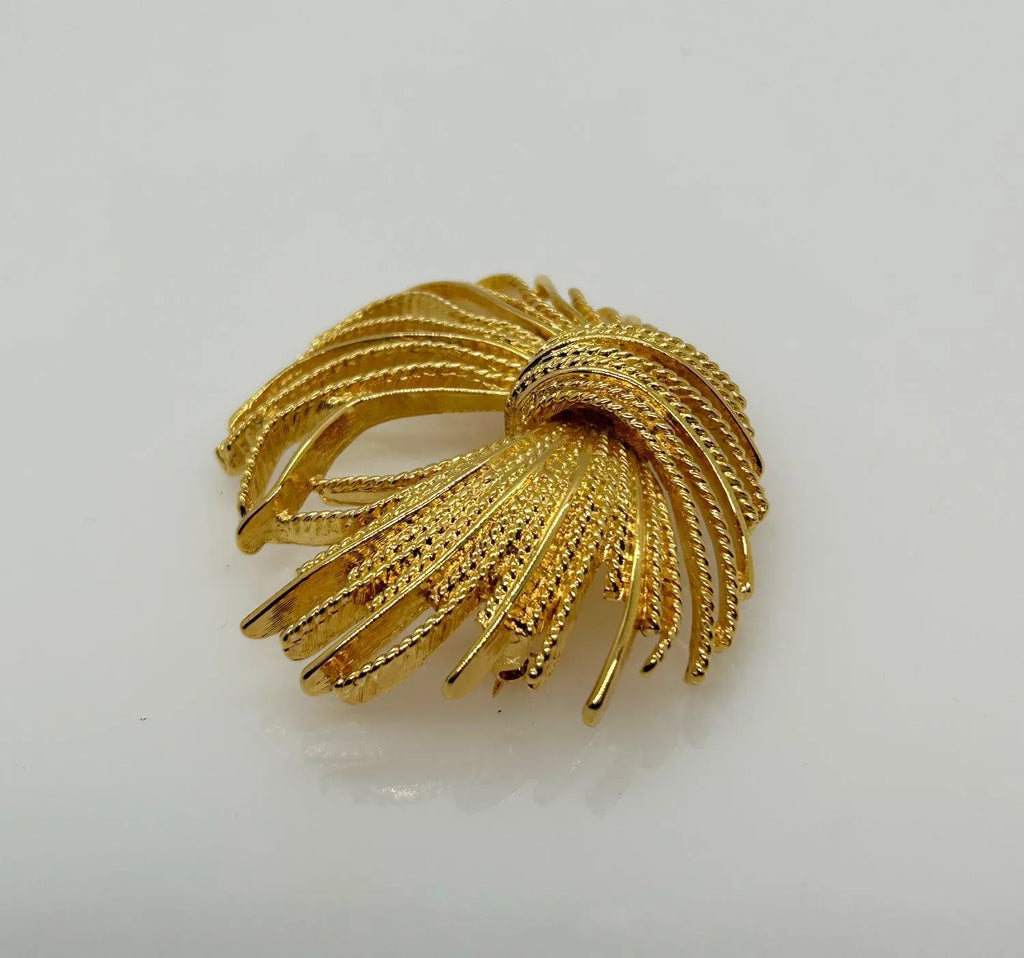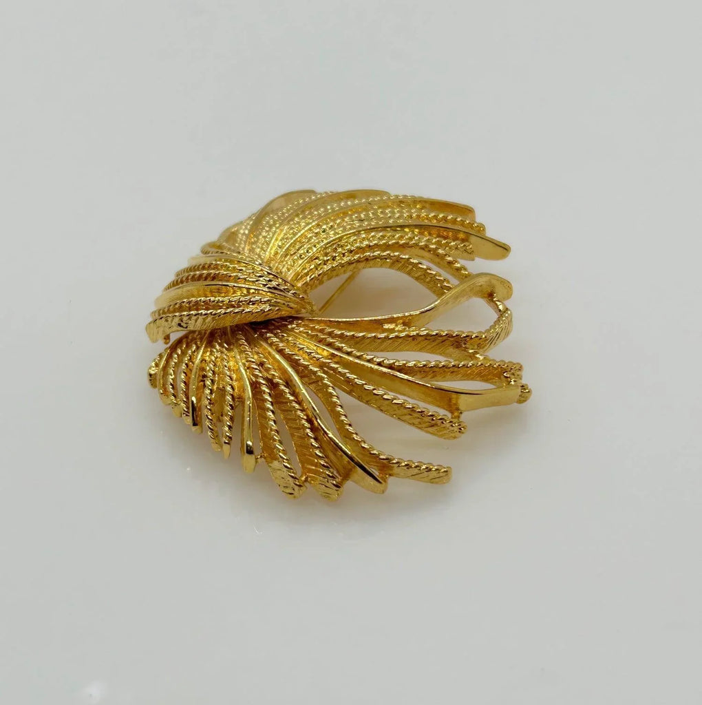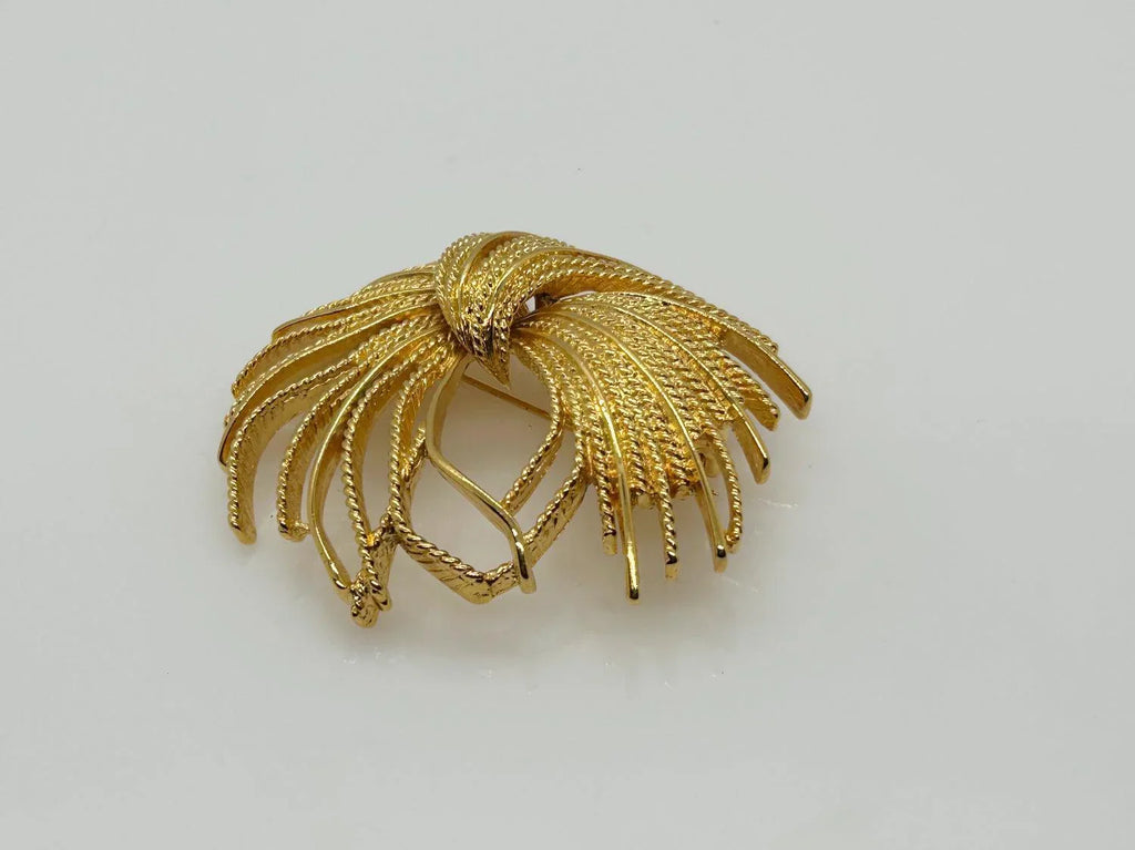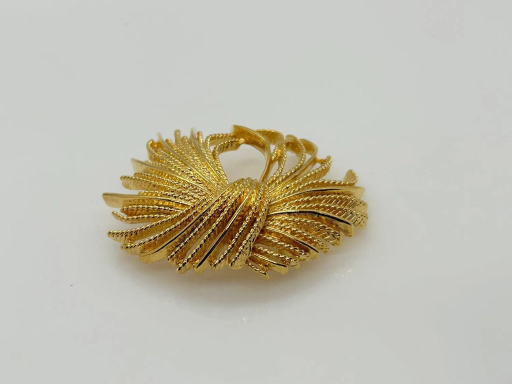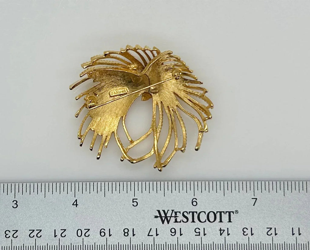 Immerse yourself in the captivating allure of this stunning 1960s Monet brooch pin. It showcases a mesmerizing gold-tone, meticulously textured tassel design, masterfully crafted to form a unique and elegantly abstract bow, perfect for adding a touch of timeless sophistication to any outfit. Precisely measuring 2.5 inches at its widest point, this exquisite piece bears the distinguished mark of the Monet brand, boldly imprinted in block letters on its reverse, a testament to its quality and enduring style.