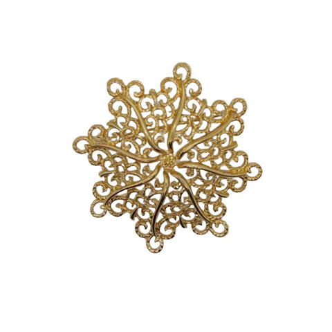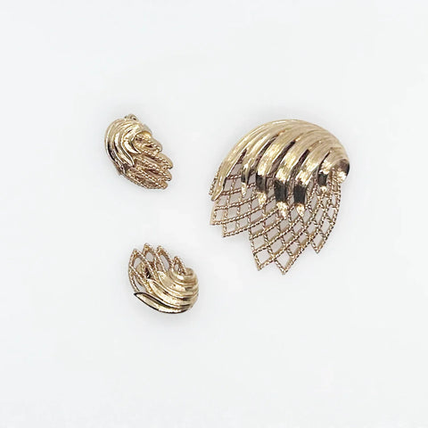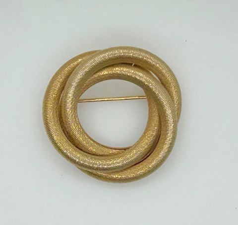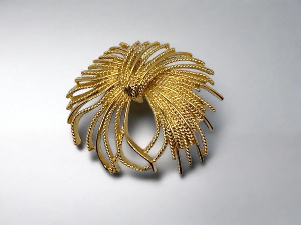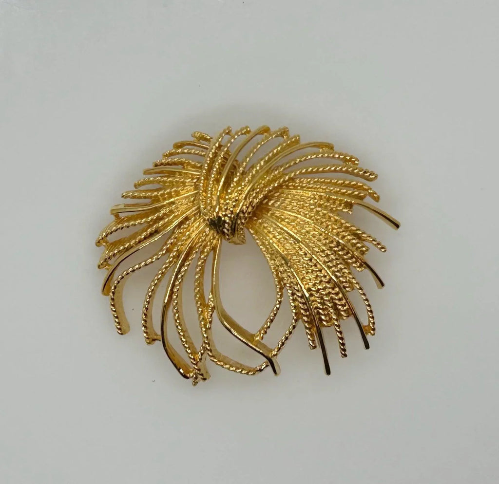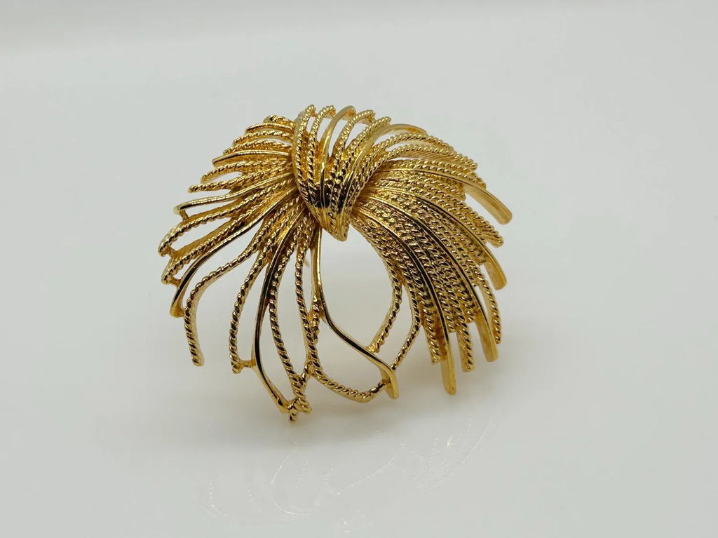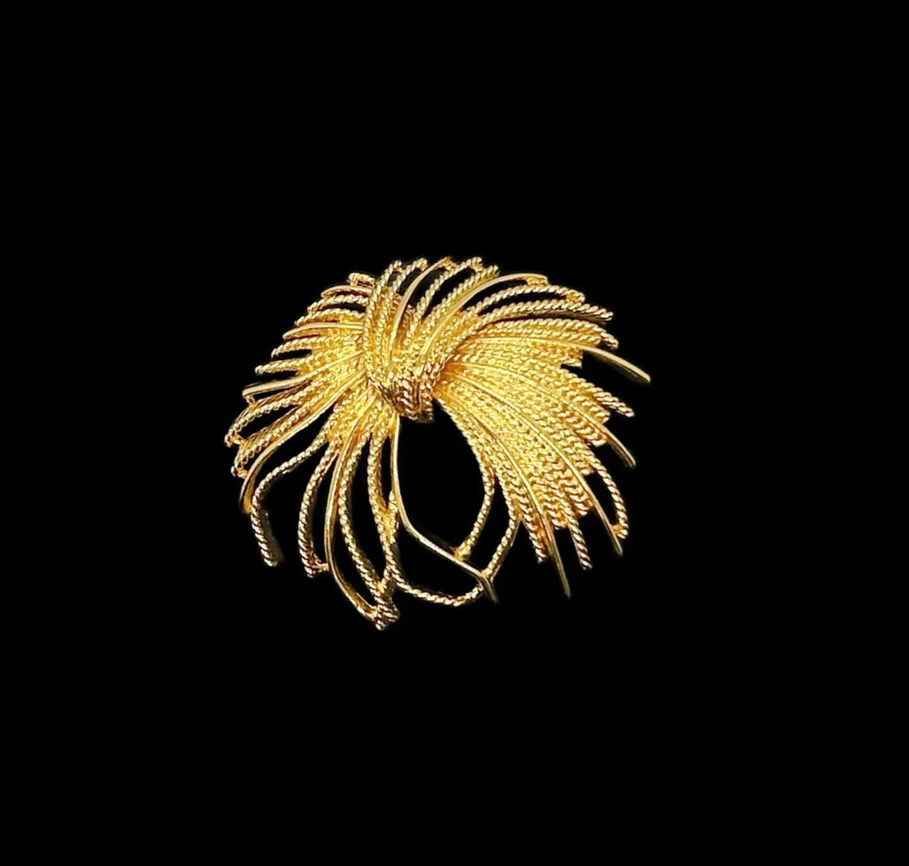 Immerse yourself in the captivating allure of this stunning 1960s Monet brooch pin. It showcases a mesmerizing gold-tone, meticulously textured tassel design, masterfully crafted to form a unique and elegantly abstract bow, perfect for adding a touch of timeless sophistication to any outfit. Precisely measuring 2.5 inches at its widest point, this exquisite piece bears the distinguished mark of the Monet brand, boldly imprinted in block letters on its reverse, a testament to its quality and enduring style.