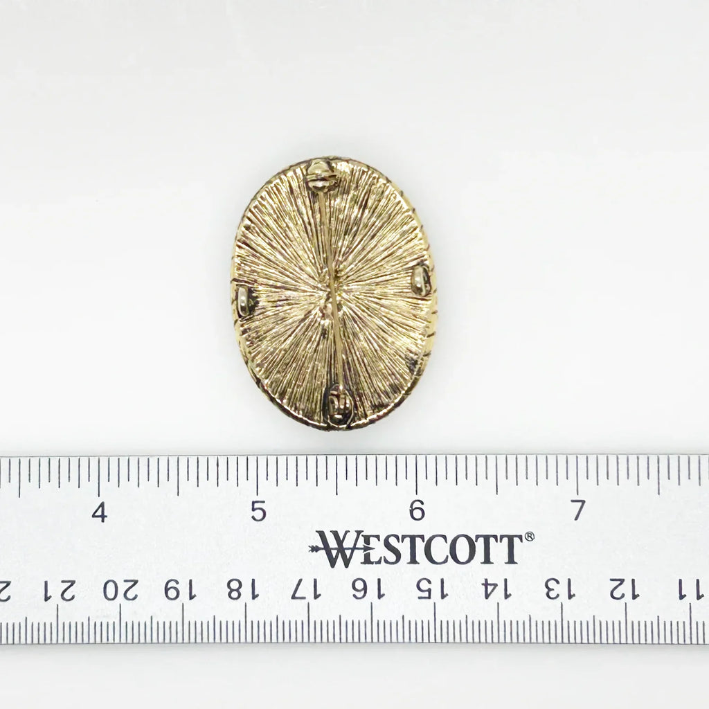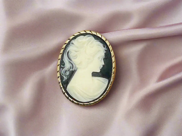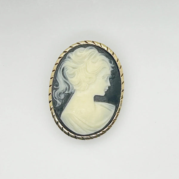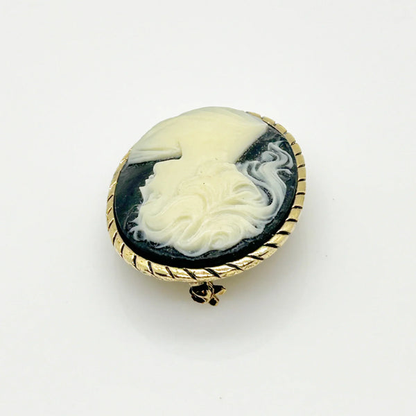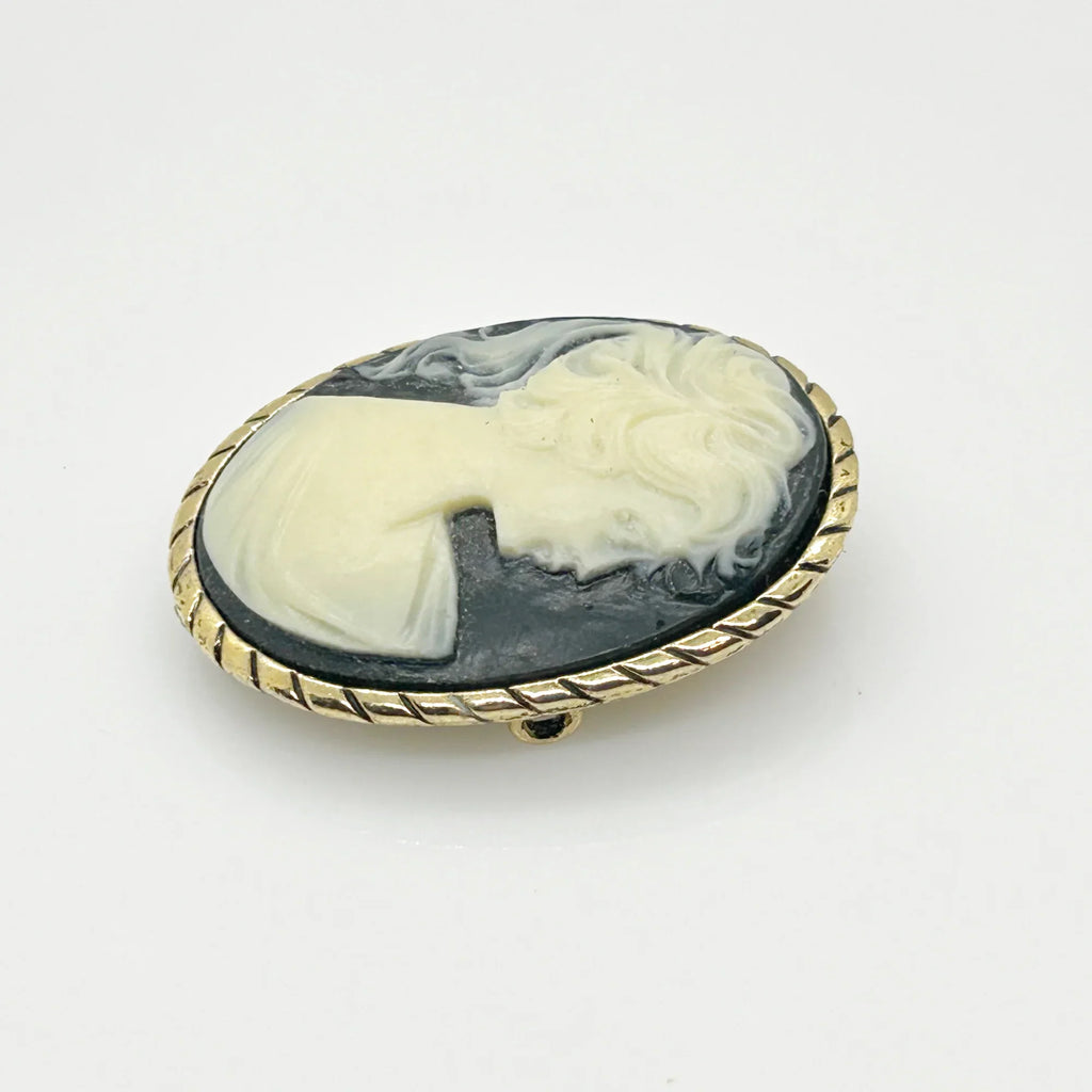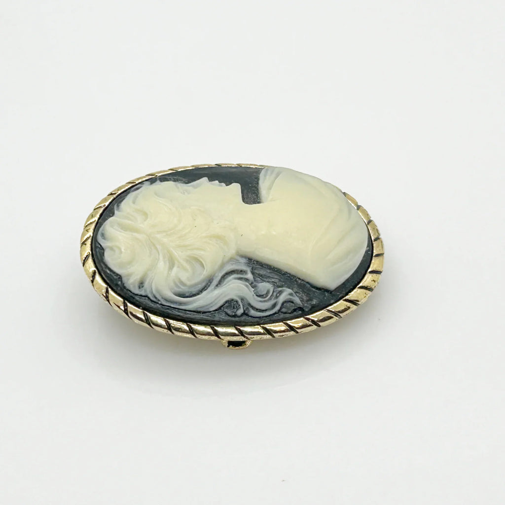 Indulge in timeless sophistication. With its sleek gold-tone oval and intricate rope detailing, this black and white cameo brooch elevates any outfit. The textured reverse creates a sensory experience, while the versatile design with pin clasp and mystery loops will add dimension to your wardrobe. The brooch measures 1.5" long and is in very good to excellent condition.
