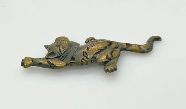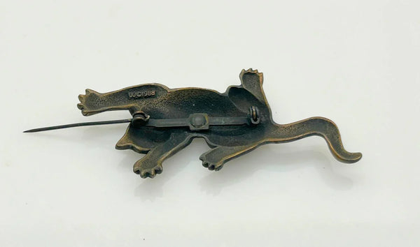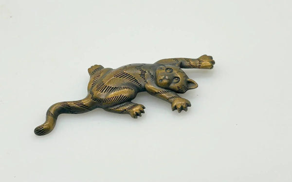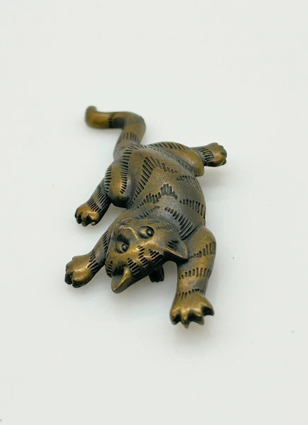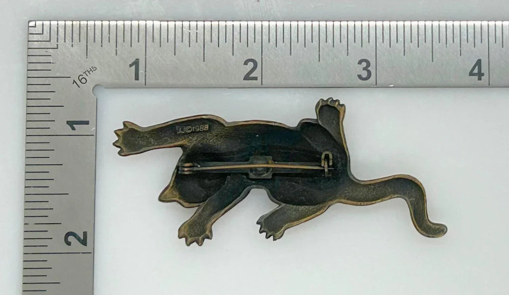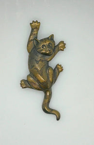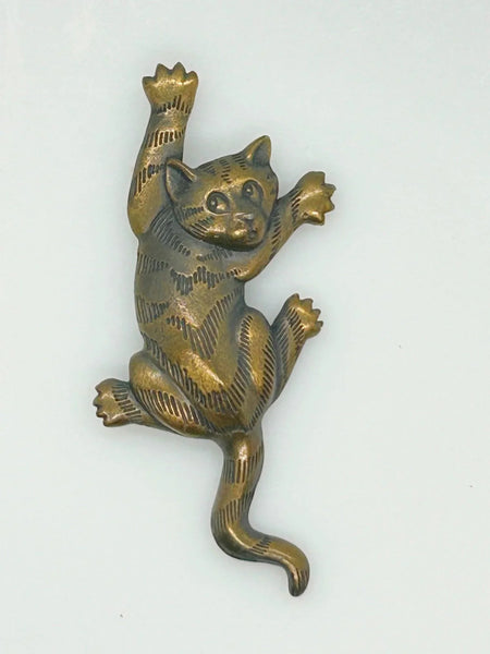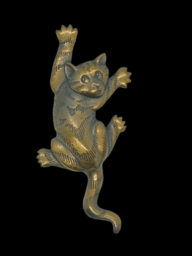 The more you look at this charming brooch, the cuter it becomes. This whimsical climbing cat evokes the iconic "Hang in There" kitten, with its tenacious pose. The captivating gaze of the cat is truly endearing. Measuring 3 inches in length, it's signed JJ1988, a delightful piece from the 1980s.