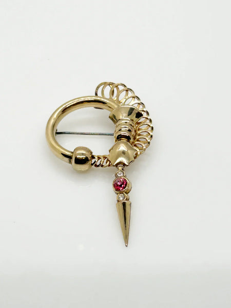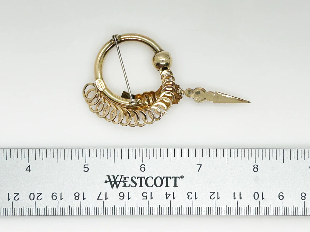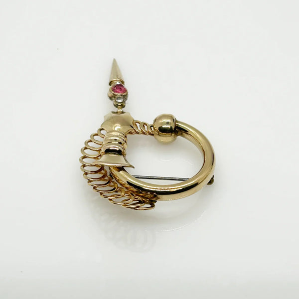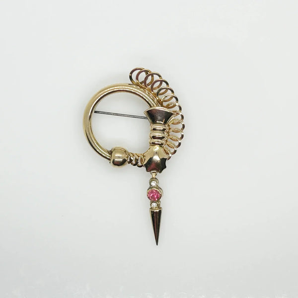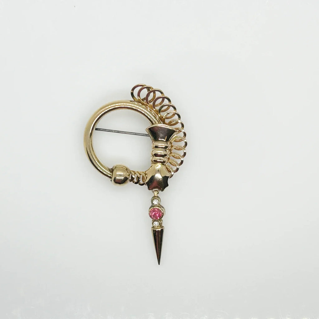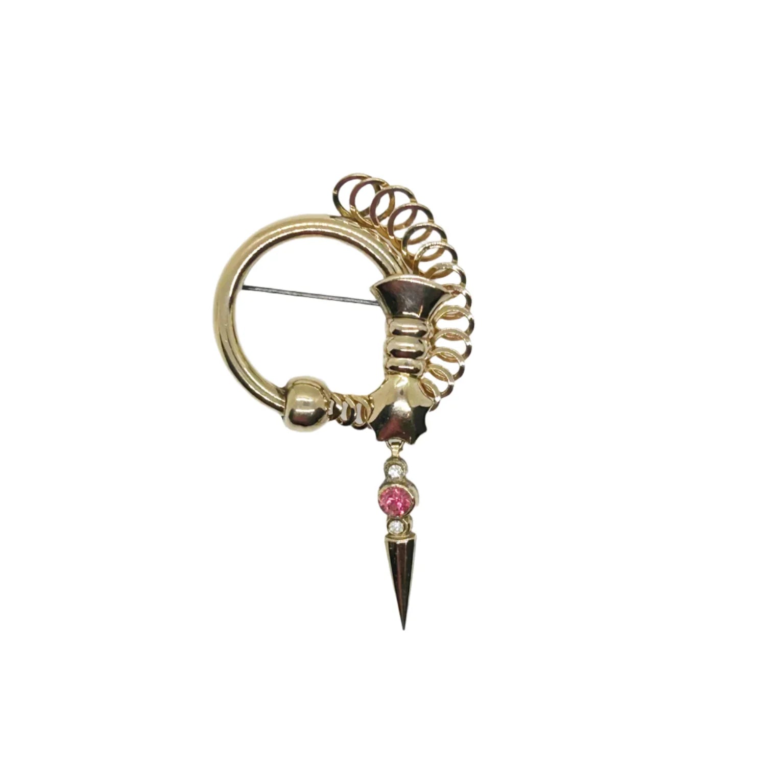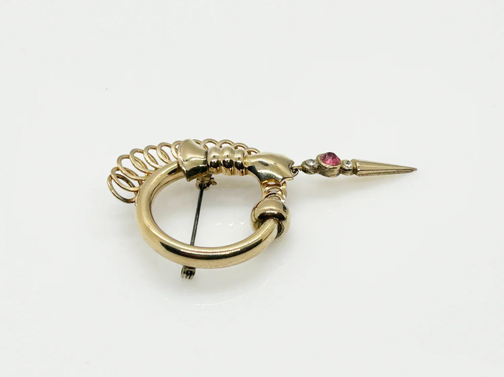 Beyond its emotional appeal, this brooch offers practical benefits. Its intricate 1/20 12kt gold work ensures both durability and lasting shine. The delicate pink and clear dangle stones catch the light, adding subtle sparkle to your ensemble. At a size of 1¼" by 3", it’s perfectly proportioned to make a statement without overwhelming your look. The uniquely 1930s design combines geometric loops with a striking dagger-shaped drop
