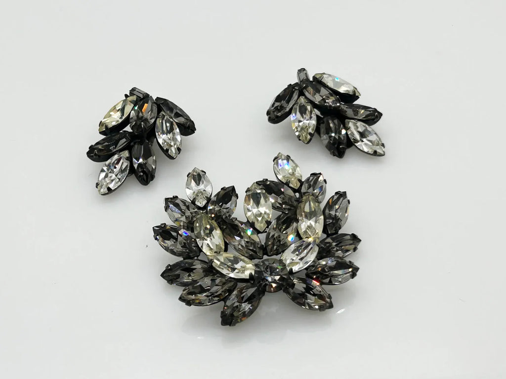 Sparkling Gray and White Vintage Rhinestone Brooch and Earrings