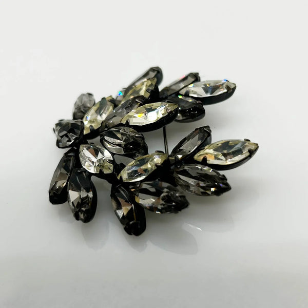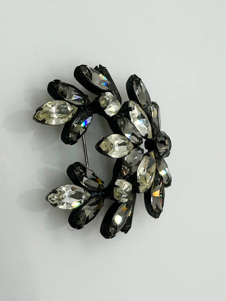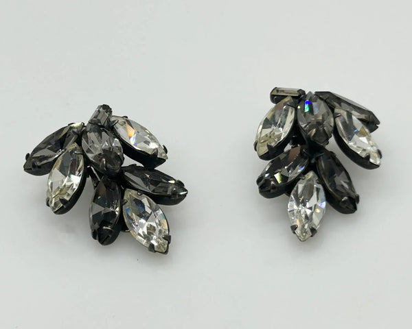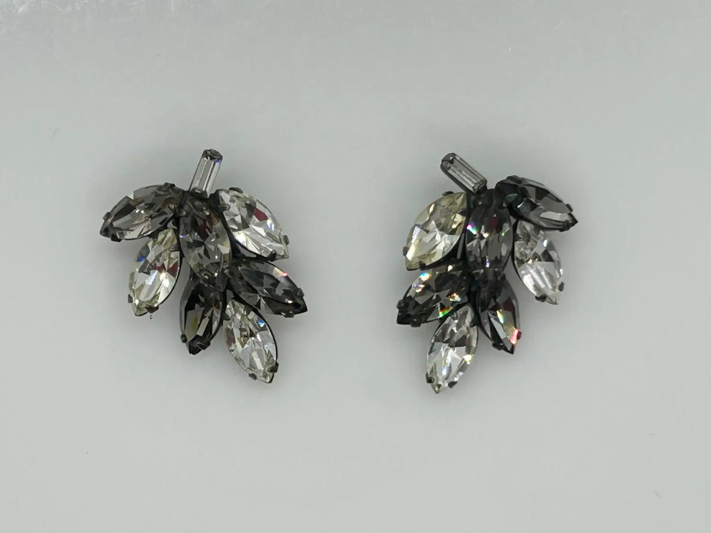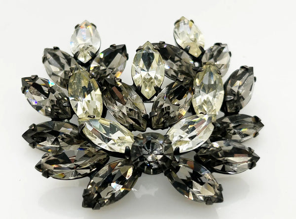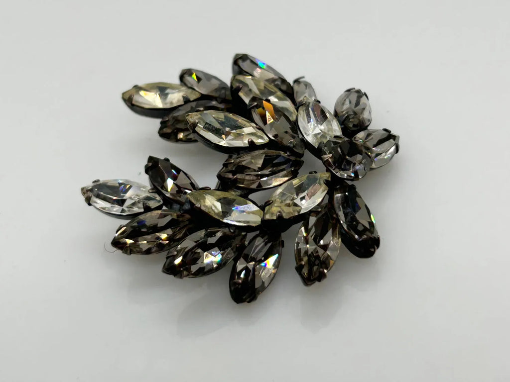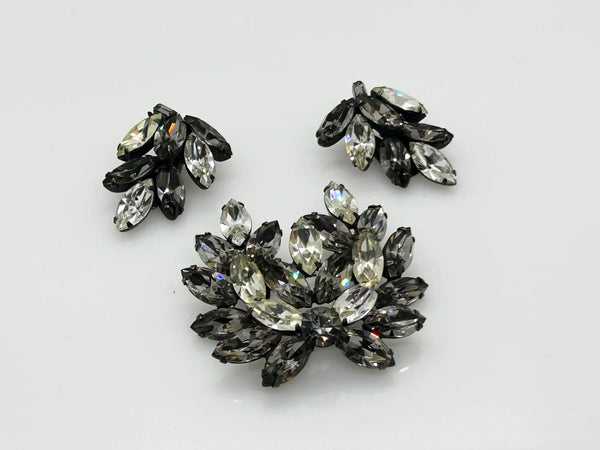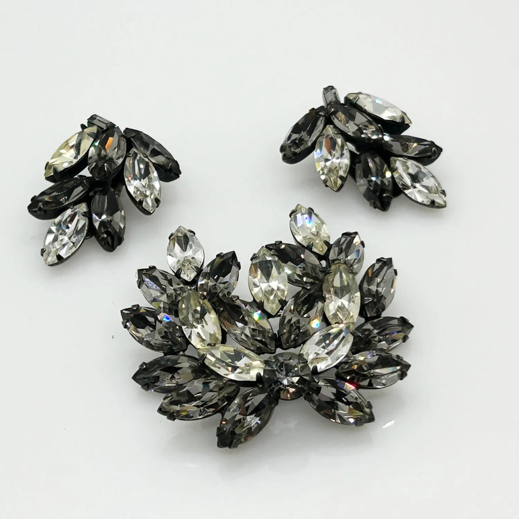 This is a gorgeous set of pin and earrings made with marquise and round shaped rhinestones in gray and clear. They are nestled in a layered, dark metal setting. The stones are standout bright and very sparking, great condition other than some wear on reverse. The earrings are clip on, hinge back. Free Shipping