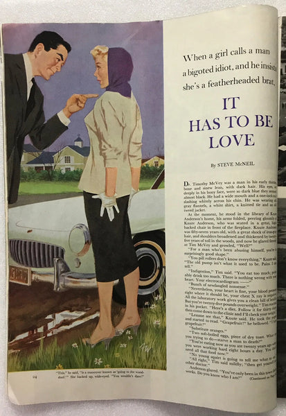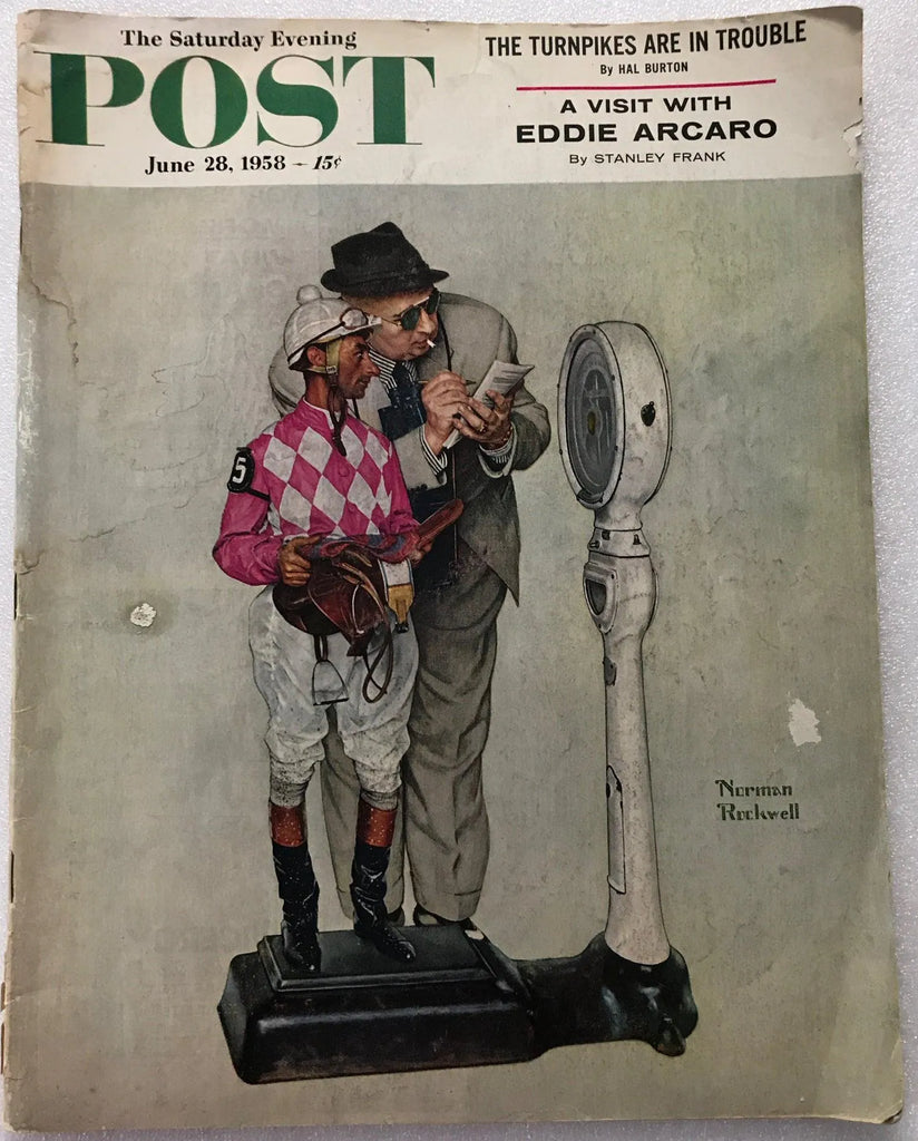 This vintage Saturday Evening Post magazine boasts a Norman Rockwell cover, an illustration of jockey Eddie Arcaro as well as a visit with Arcaro; short stories including one by Rex Suit, Disneyland, turnpikes; bridal presents, article on antique steam traction engine, . Also, verse, letters, editorials and more.