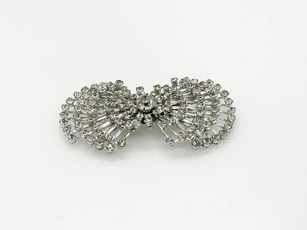 Here is a detailed description of this captivating vintage pin: This truly unusual and abstract vintage pin features a stunning array of round rhinestones elegantly set in a silvertone base. Measuring approximately 3" in length, this piece demonstrates exceptional craftsmanship and is preserved in very good to excellent condition, showcasing its enduring beauty. The clever layering of the design elements enhances the brilliance, allowing the rhinestones to beautifully catch and reflect the light, making this pin a true statement piece.