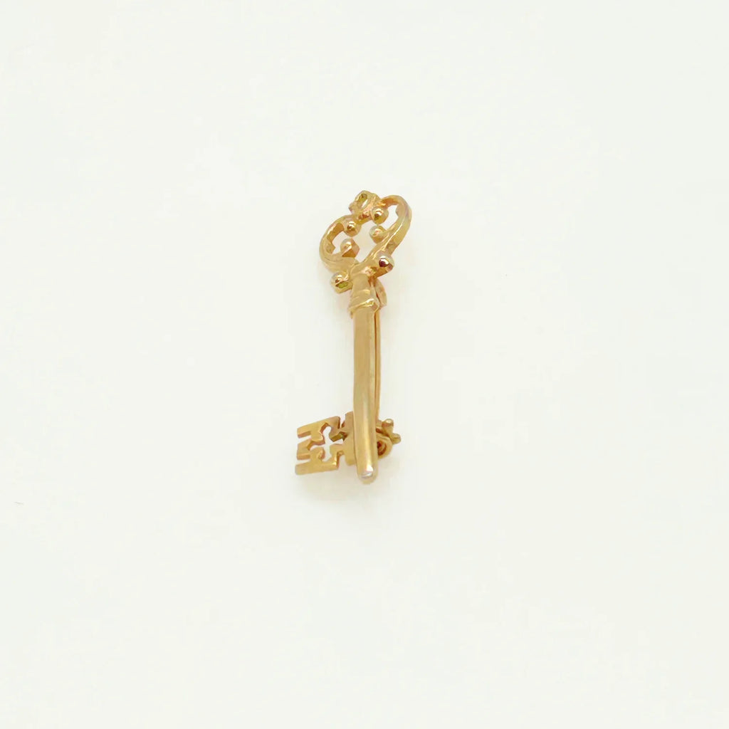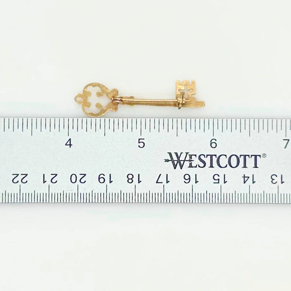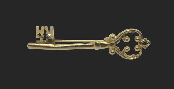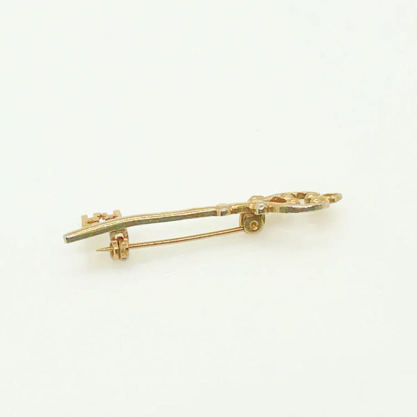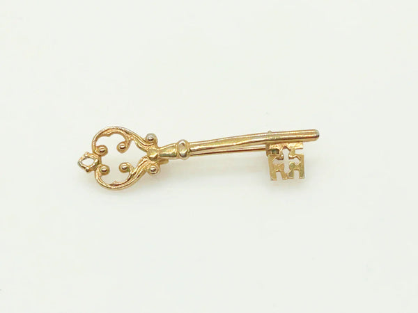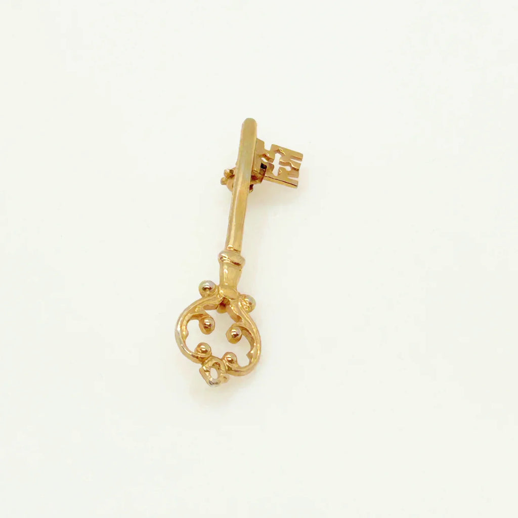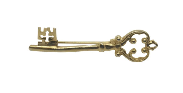 This delicate, intricately-crafted vintage key brooch boasts a length of 1 3/4", and is crafted from a golden-toned metal in outstanding vintage condition. Unlock your elegant side with this exquisite tiny vintage key brooch. Boasting a delicate length of 1 3/4" and crafted from a golden-toned metal, this brooch is a true testament to outstanding vintage craftsmanship. Dress up any outfit and make a statement that is sure to inspire and captivate.