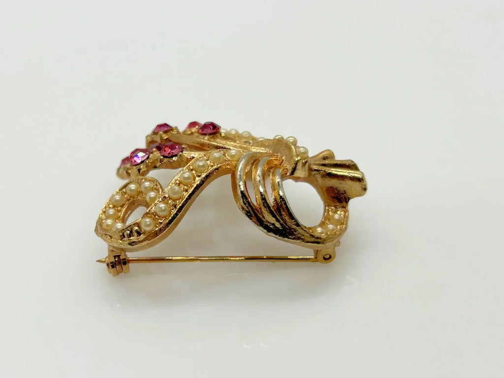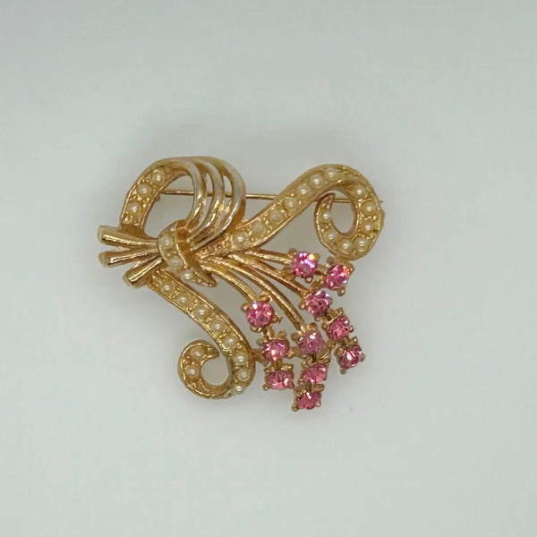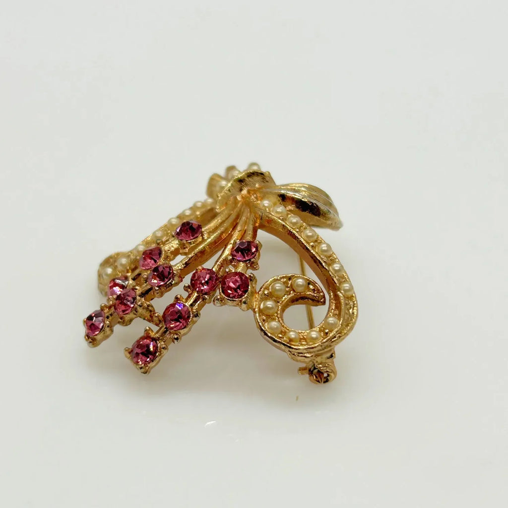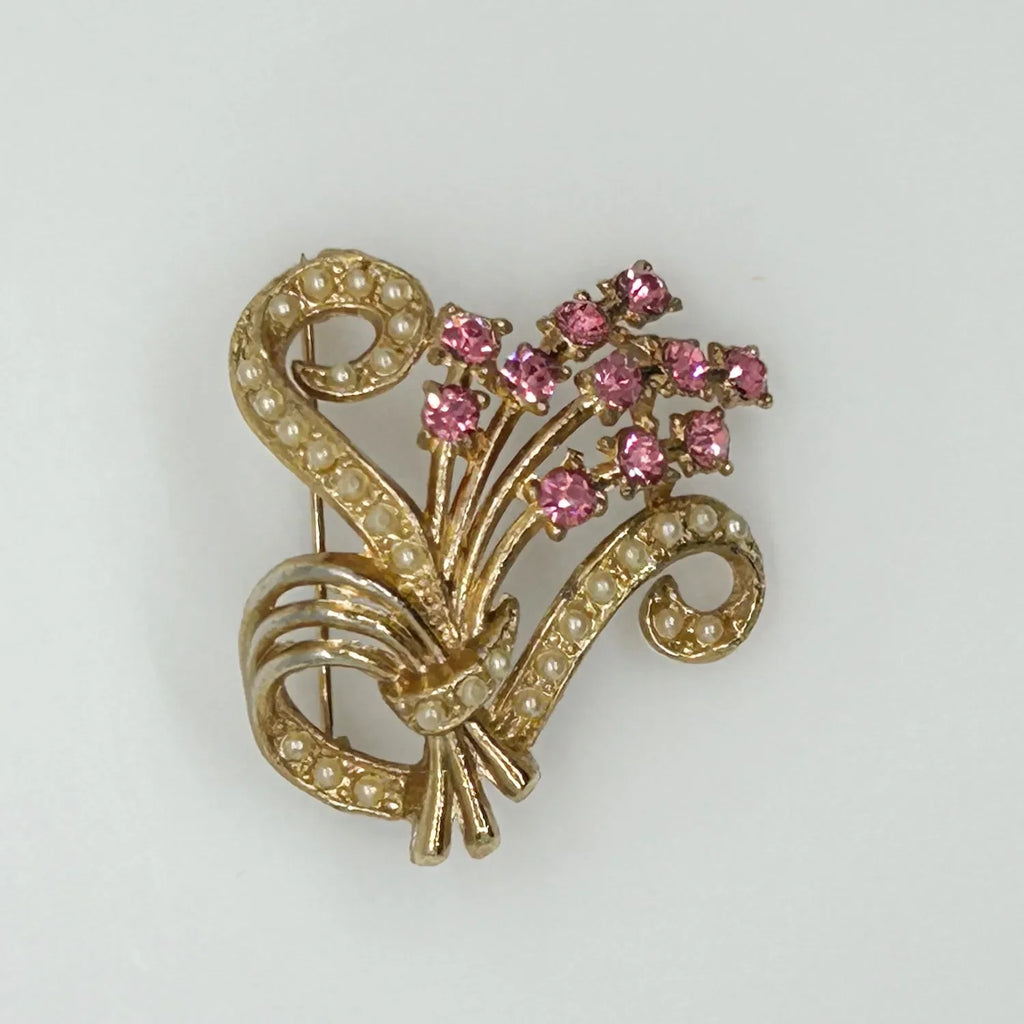 Add a touch of vintage glamour to your outfit with this exquisite brooch! Featuring a beautiful bouquet of pink rhinestones and delicate faux pearls, it's the perfect statement piece for any occasion. Measuring 1.75" in diameter and set on a golden-toned base, it's sure to become a treasured part of your collection.