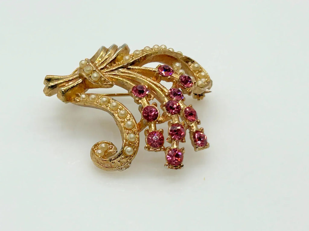 This lovely vintage brooch is a stunning addition to any wardrobe. A bouquet of pink round rhinestones with fronds of faux pearls rest atop a golden-toned base. It measures 1.75” and has a slightly domed shape.
