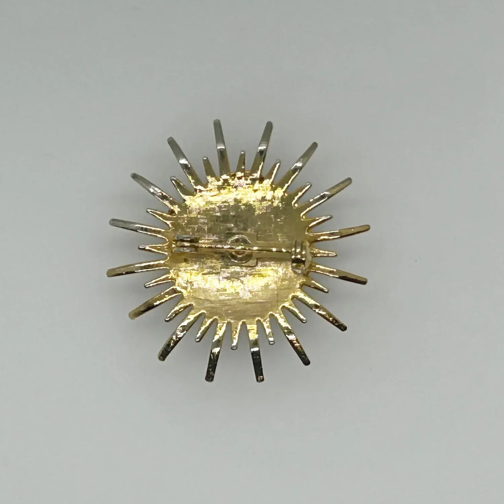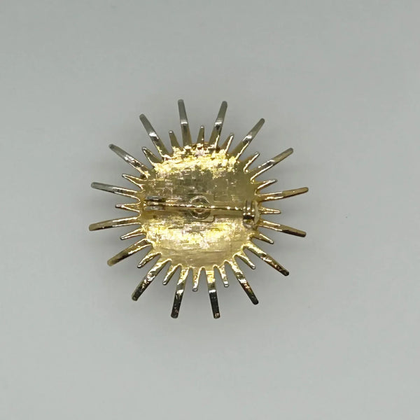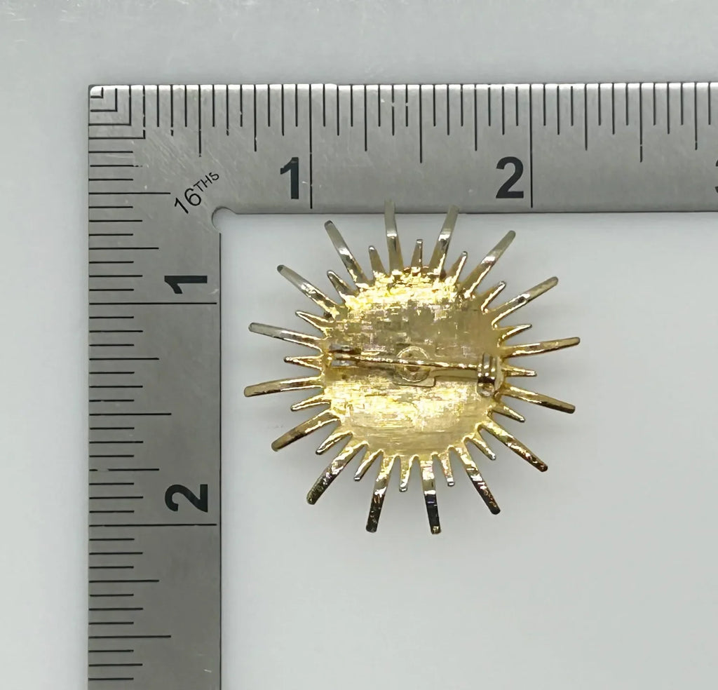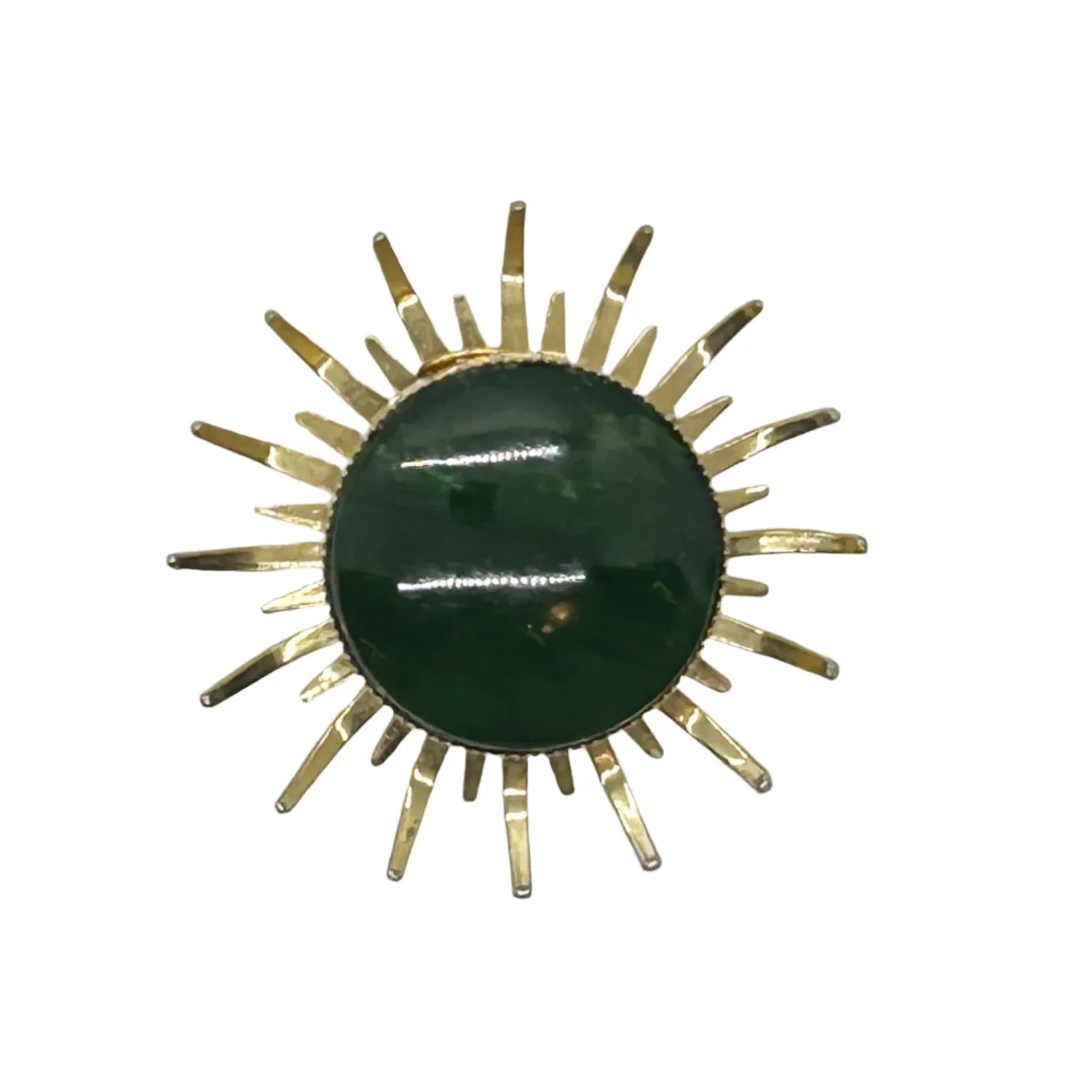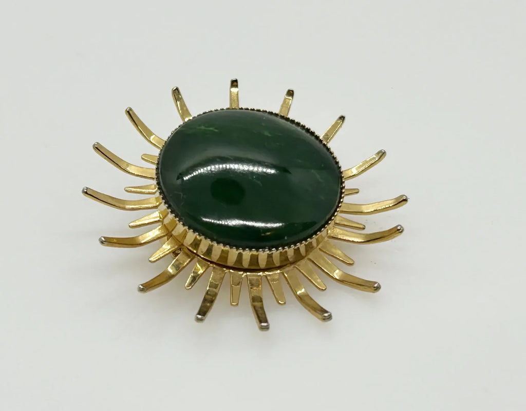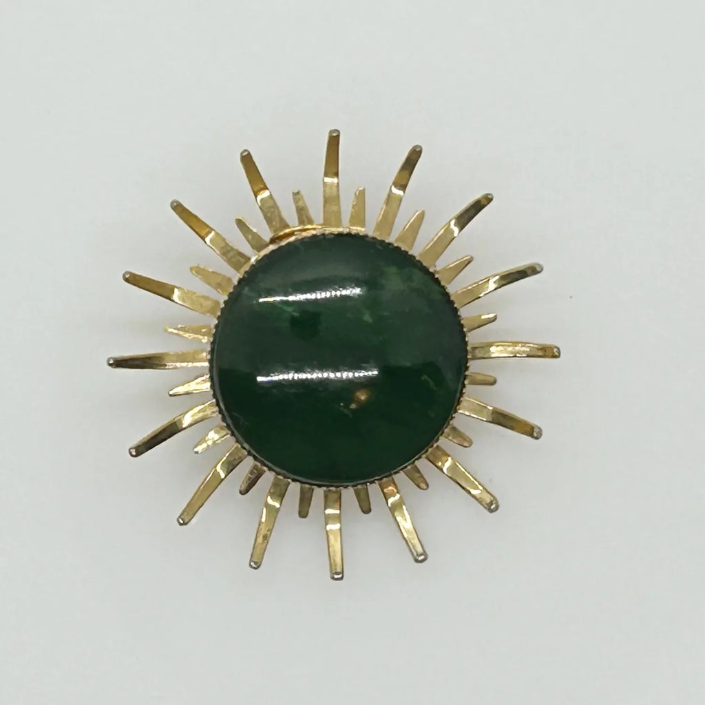 Step out of your comfort zone and add some thrill to your day with this vintage abstract brooch featuring a striking green stone at the center, encircled by stylized petals or sunrays. The textured back adds an extra touch of charm. Measuring 1.5" in diameter, it remains in impeccable condition.