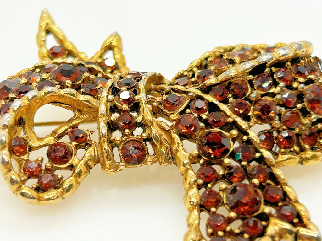 This stylish brooch is fashioned into a gold tone bow, set with rich root beer colored round rhinestones. The shades of brown and amber will make you yearn for cider and cinnamon! It measures 2.25" at its widest point and is in excellent condition.