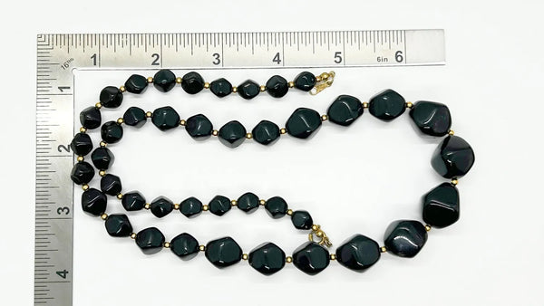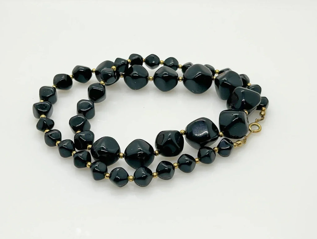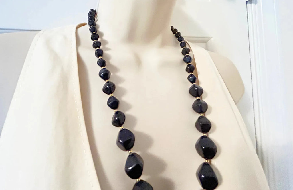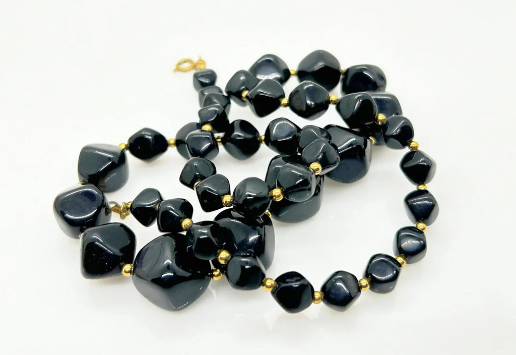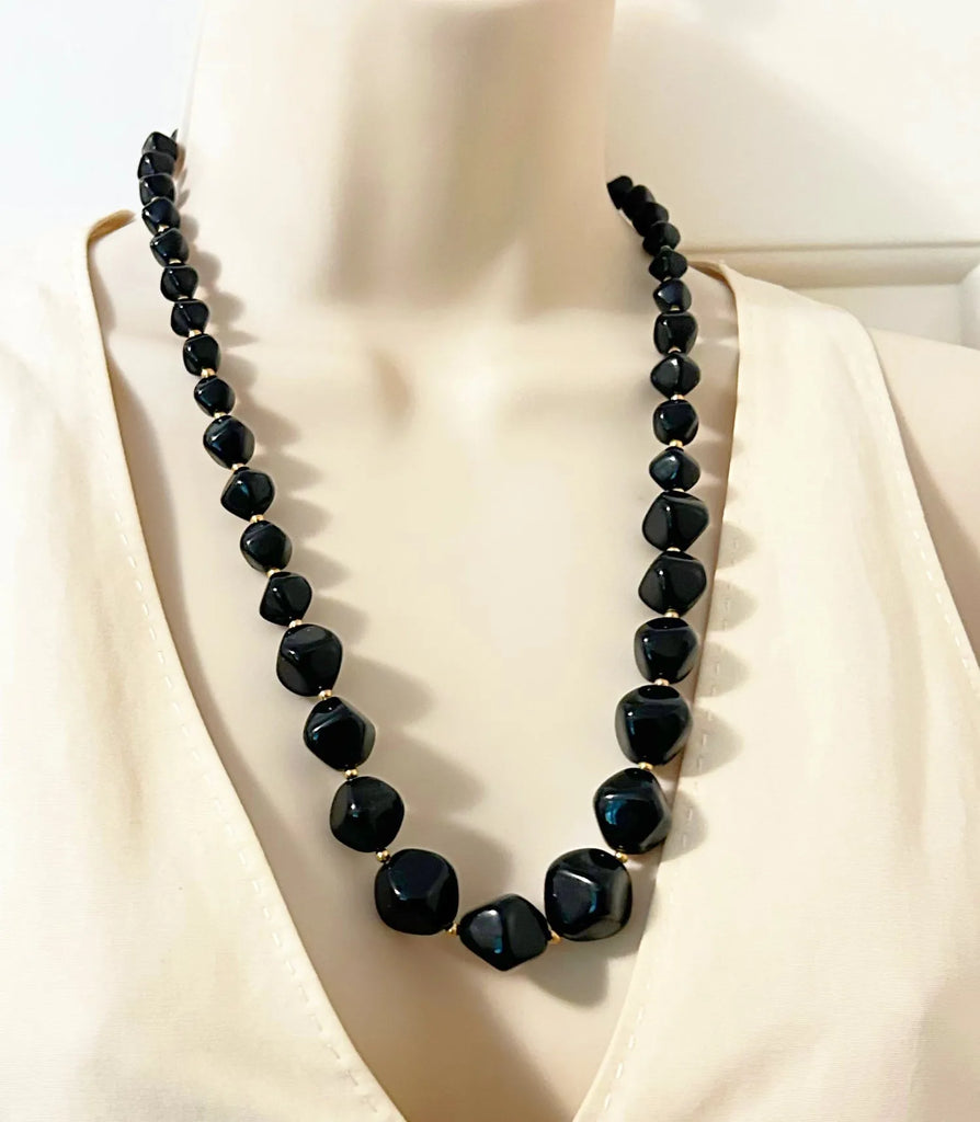 Crafted in 1986, this vintage Avon necklace features a graceful chain of graduated, asymmetrical black beads separated by gold-tone bead separators. Its spring clasp is signed “Avon” in block letters. This exquisite piece measures 24” long, complementing black or solid-color outfits while providing a bold foundation for contrasting accessories.