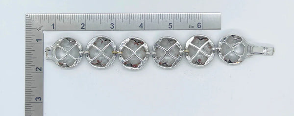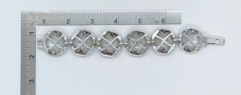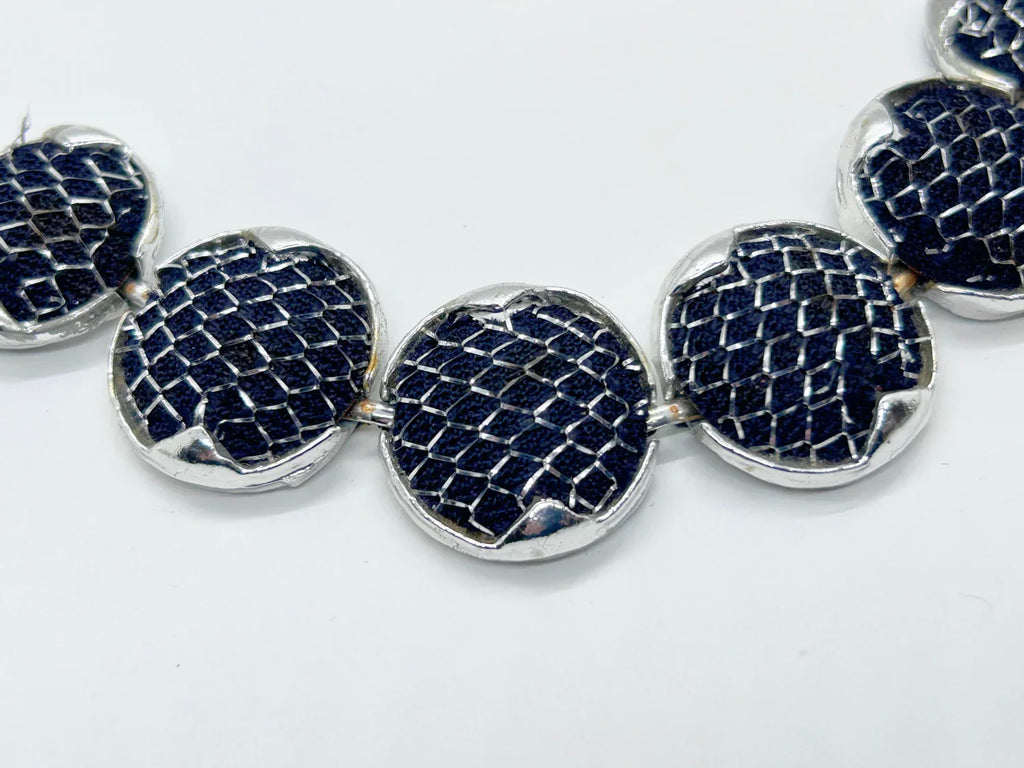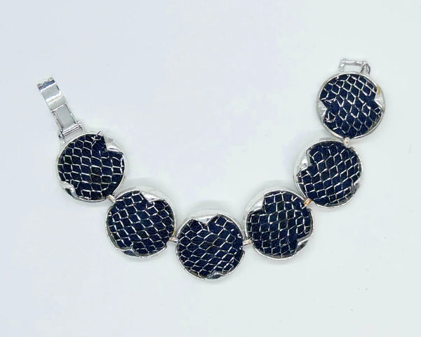 This vintage bracelet exhibits a subtle medieval charm and has been crafted with six circular silver tone frames, each containing a domed disc. The discs are secured within the frames with black netting and finished with a silver mesh. The fold-over clasp provides a secure closure, while the bracelet measures 7" inches in total; each link being approximately 1" in diameter. Its excellent vintage condition is certain to delight.