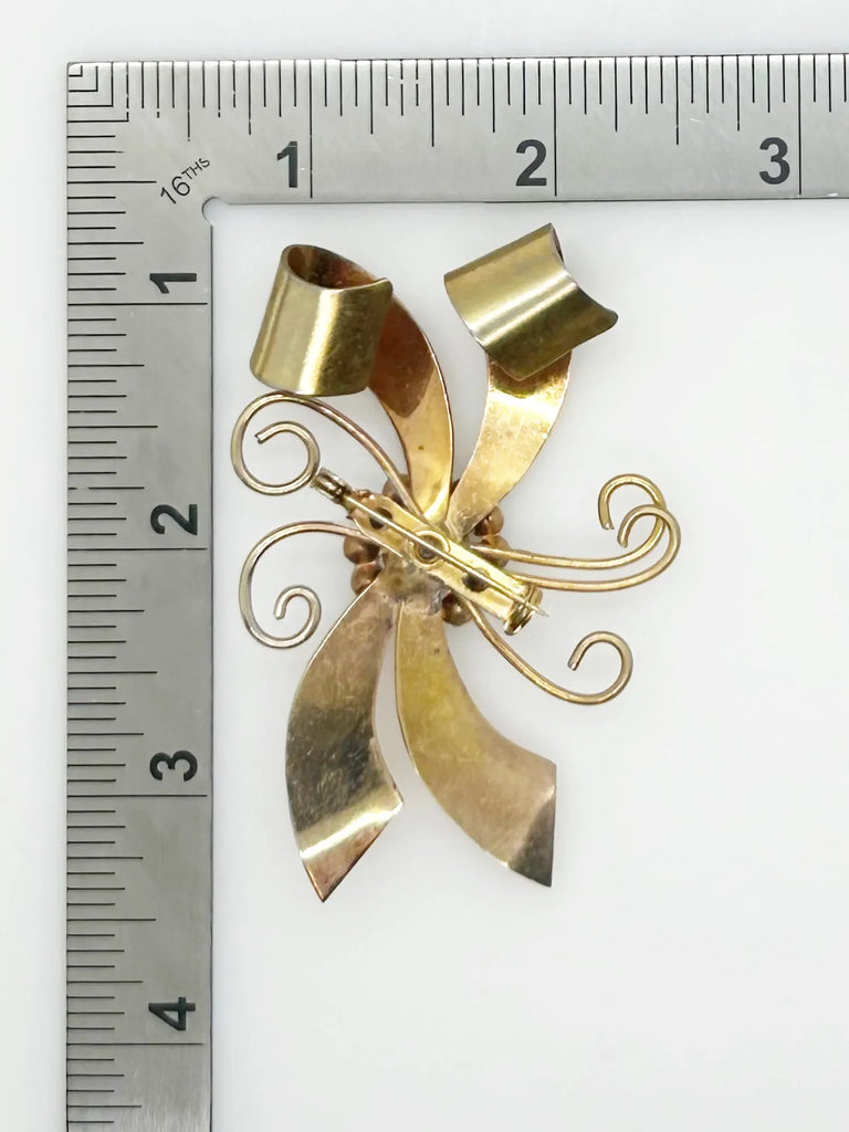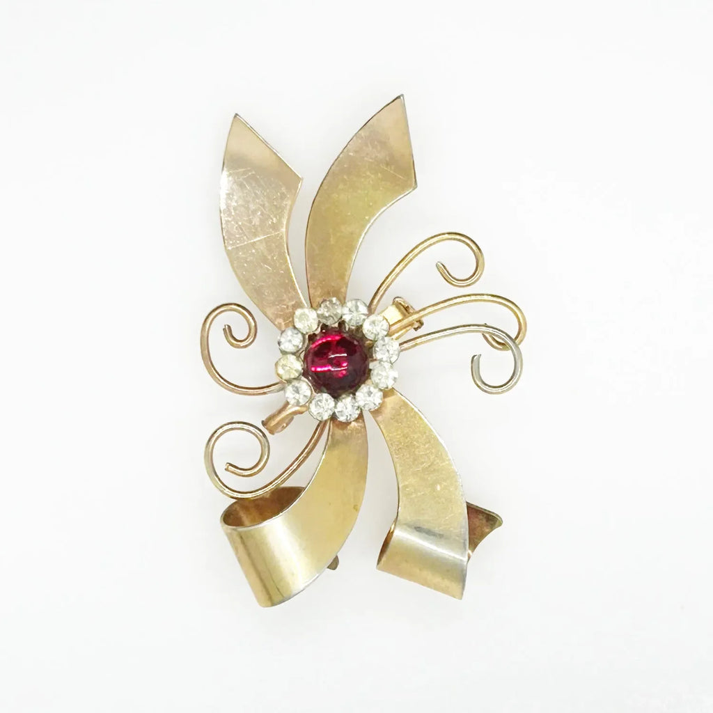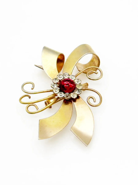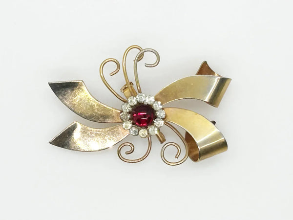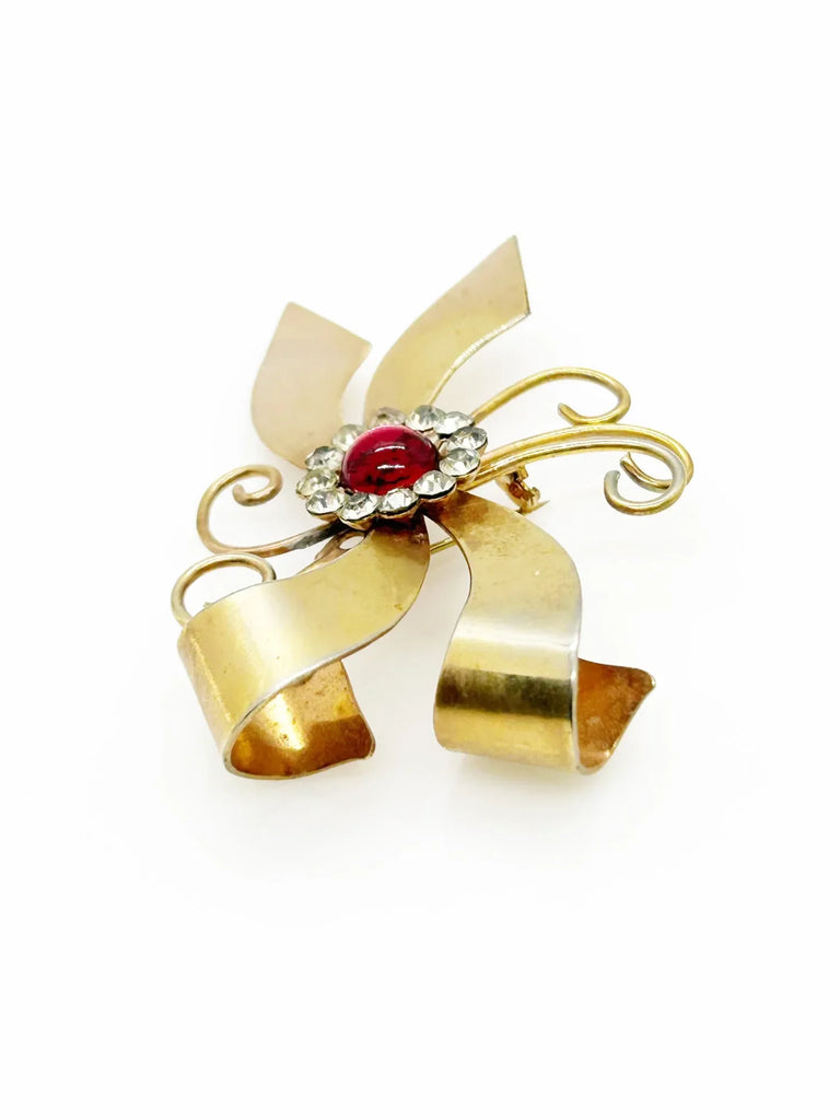 Vintage Abstract Bow Brooch with Red Cabochon and Bright Rhinestones