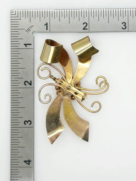 Dress up your look with a touch of vintage chic! The charming bow brooch, adorned with a round cabochon and vibrant rhinestones, adds a playful and unique flair to any outfit. Embrace its character and make a bold statement with this 2.75" accessory. Don't be afraid of the slight wear and tear - it only adds to its vintage charm. Elevate your style with this must-have accent piece!