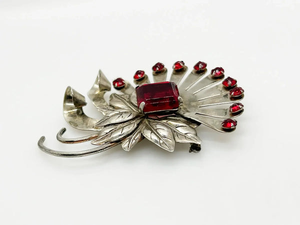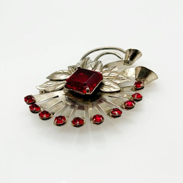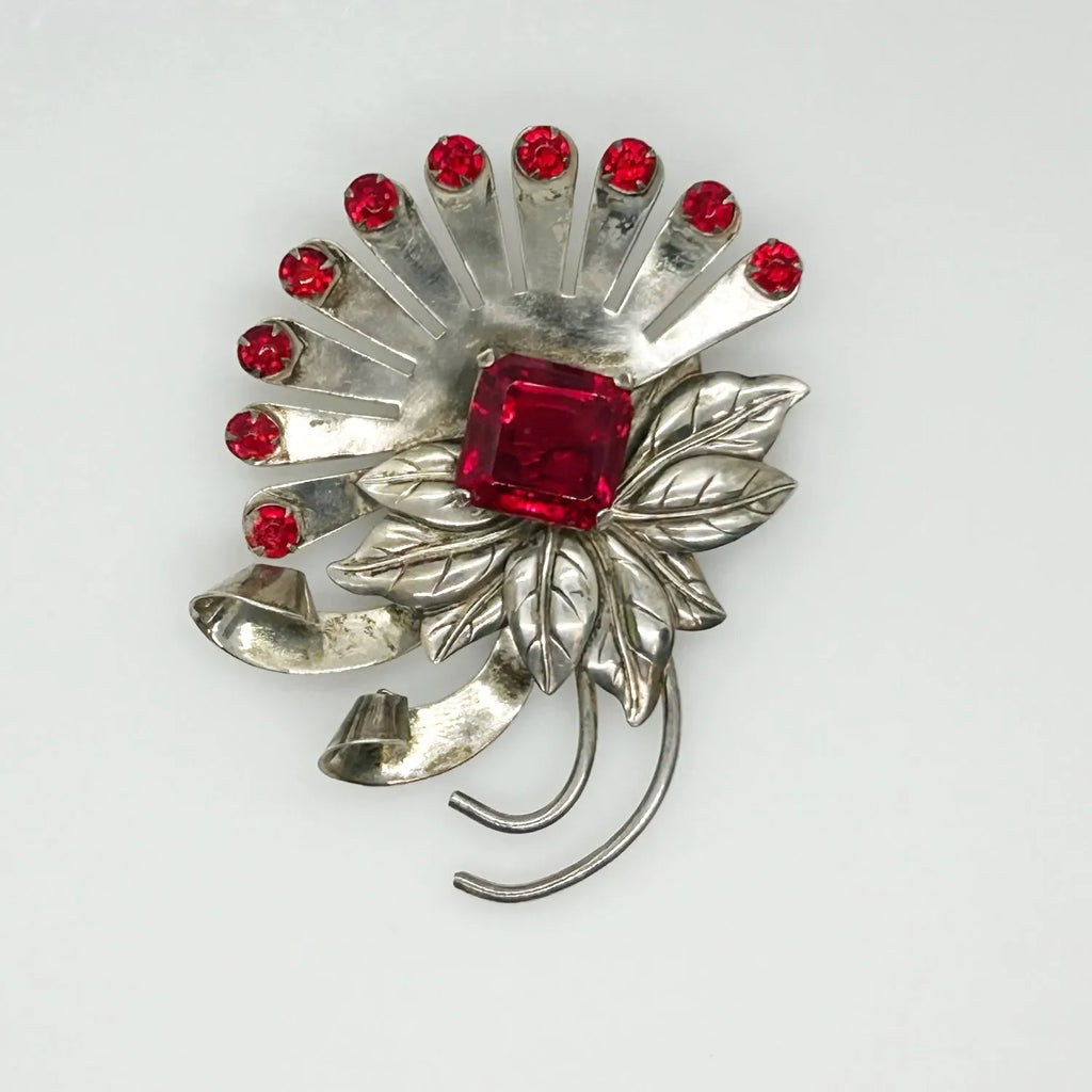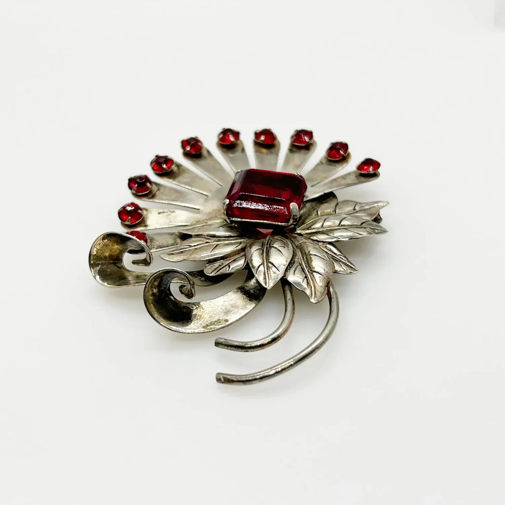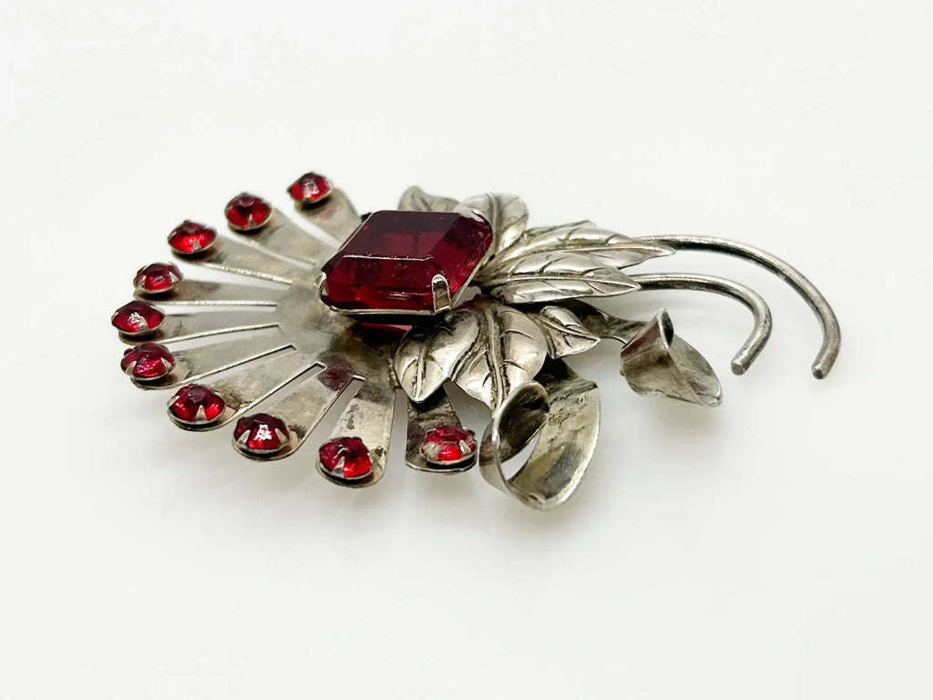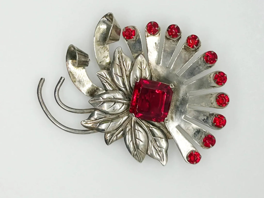 This opulent, abstract floral vintage brooch was made by Brookcraft, and is made of detailed leaves with bright red stones and la large diamond shaped center stone. The stones are open backed and the large stone is prong set. Brookcraft was in business from the 1930s until 1952. They were renowned for their fine, handmade pieces and use of Sterling Silver. The best quality stones were used. were handmade. The brooch measures 3" long by 2.5" at its widest point. It is signed Brookcraft Sterling in block letters on a raised oval on the back. Free Shipping