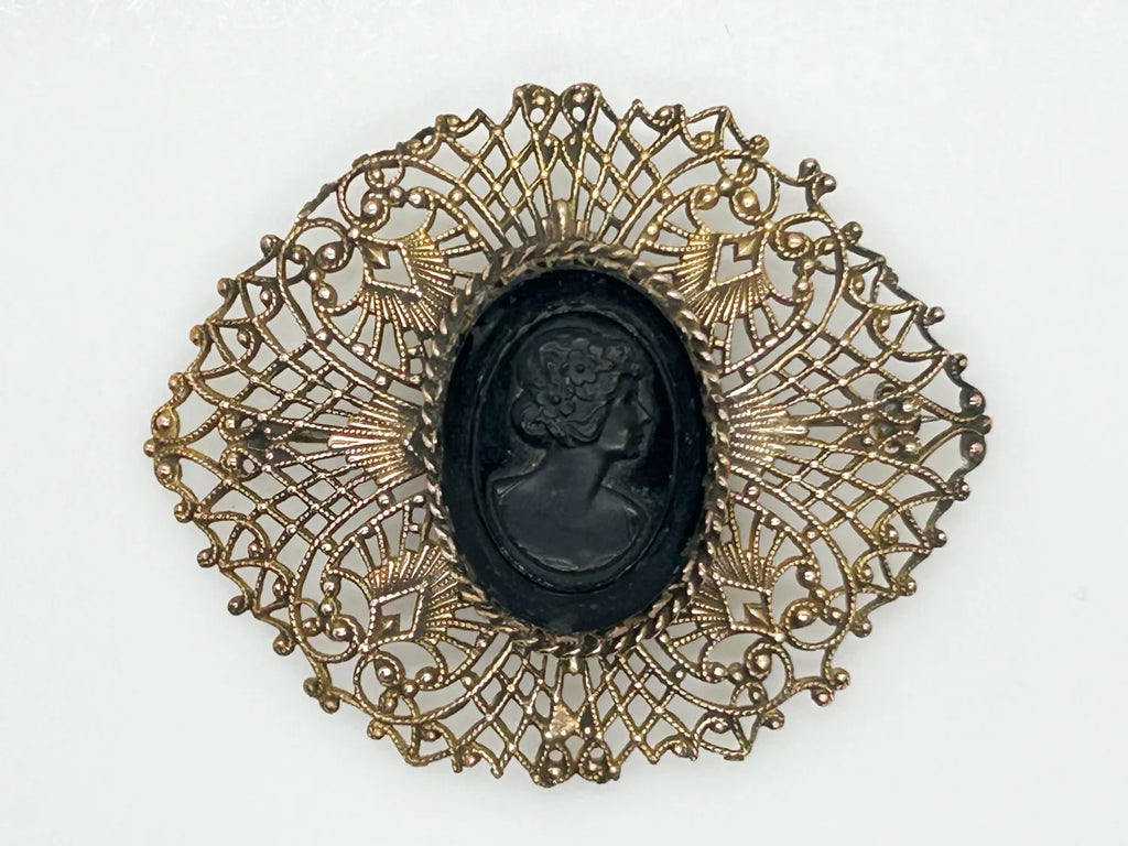 This is a remarkable brooch. At the center is an oval cameo in black stone, showing a female figure. It is held in place by elaborate prongs and sits on an intricate metal lacework frame. The back is as spectacular. In whole, the brooch measures 3” across and 2.5” tall. Free Shipping