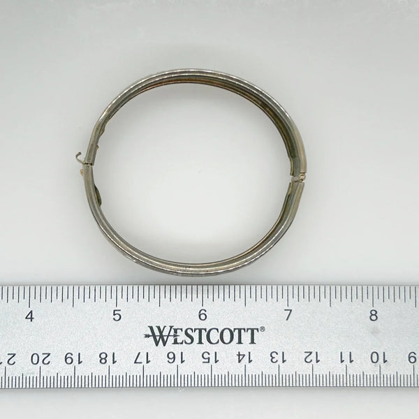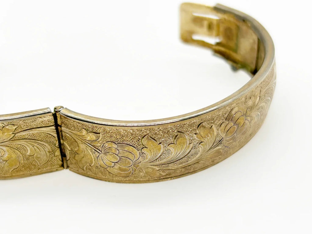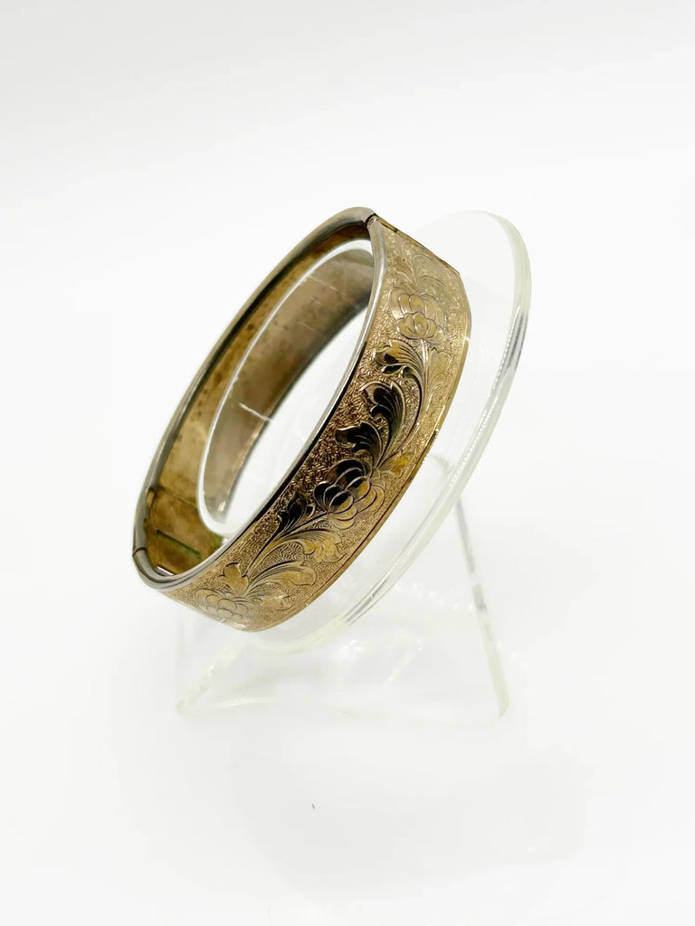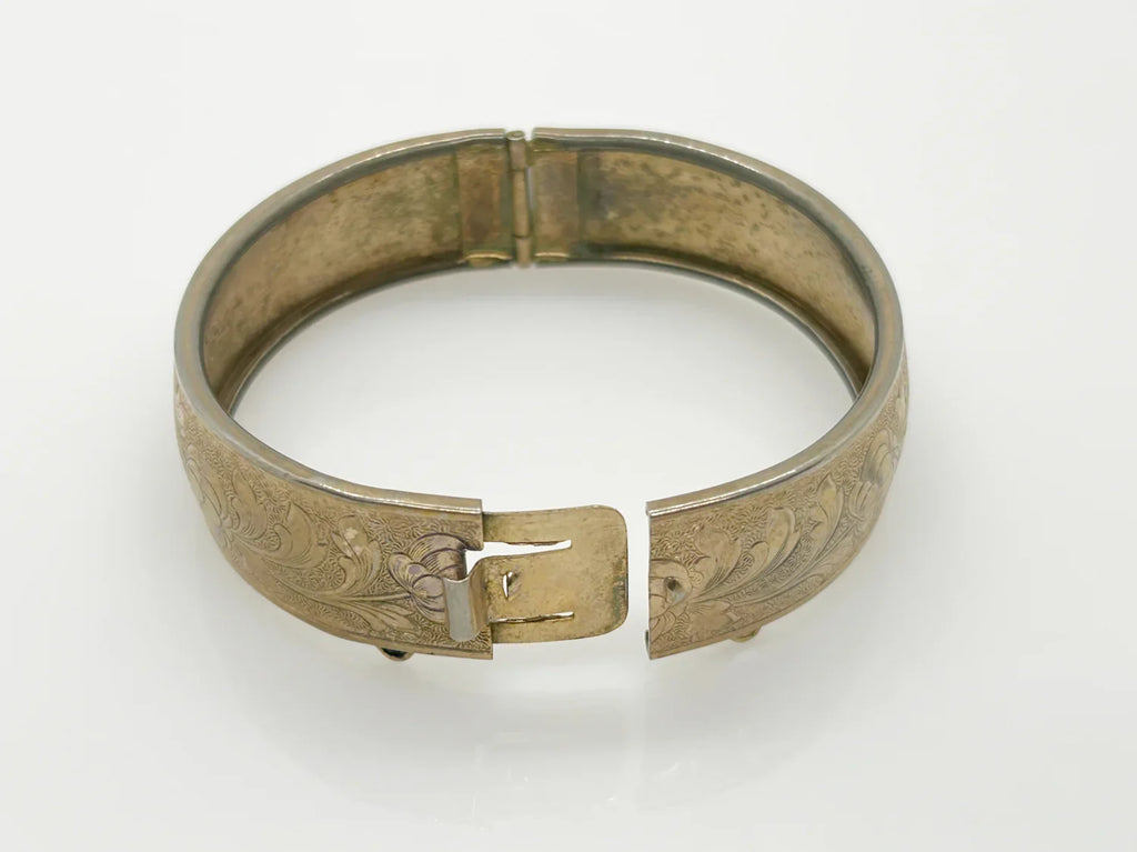 Add a new dimension to your style with this striking vintage bangle adorned with intricate etchings of swirling patterns and delicate designs. Standing at a height of .5", it effortlessly adds a unique touch to any ensemble. While it may be missing a safety chain, rest assured that the clasp is secure, allowing you to wear it with confidence. Don't miss out on this one-of-a-kind piece that will elevate your style to new heights!