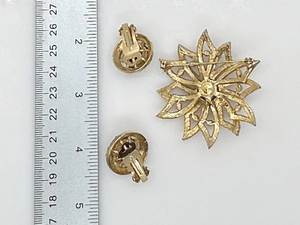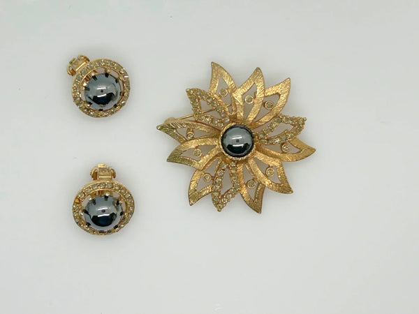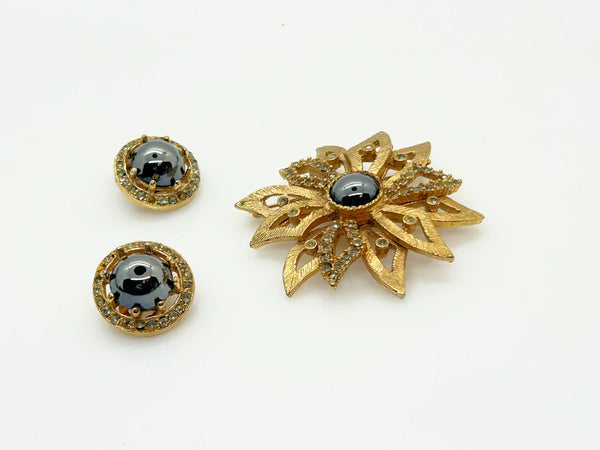 Vintage Flower Brooch and Earring Set with Luminous Black Glass Stones