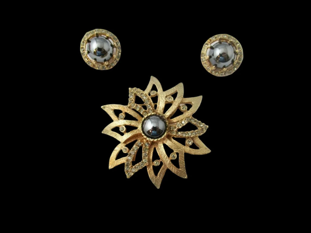 This vintage brooch and earring set showcases a multi-petaled flower with round gray rhinestones, centered with black glass round stones. The earrings measure 3/4" across, with the round stone at their center, encircled by gray rhinestones—a classic, elegant design. The pin measures 2" across and is composed of brushed gold metal. Condition of the set is excellent.
