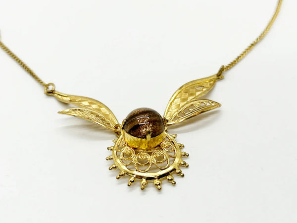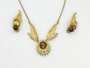 This is an unusual and intriguing vintage necklace and earring set from Germany. It has a necklace and a pair of earrings. The necklace has two detailed, delicate filigree wings of each side of a round sparkling gold tone looking glass. It is set on a round filigree base. The earrings follow the same pattern. It's a beautiful set.