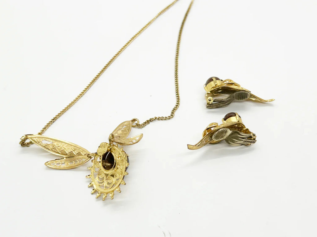Indulge in the elegant sophistication of this vintage filigree necklace and earring set from Germany. Each piece features intricate filigree details and a sparkling gold stone tiger's eye-looking glass, exquisitely crafted to add a touch of glamour to any outfit. And with a secure spring safety catch and gentle drop, it's both functional and stunning. A true collector's item, marked with an iconic Western Germany stamp, this set is sure to turn heads and become a treasured addition to your jewelry collection.