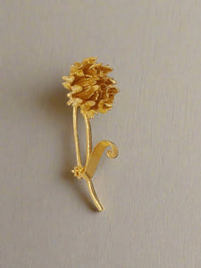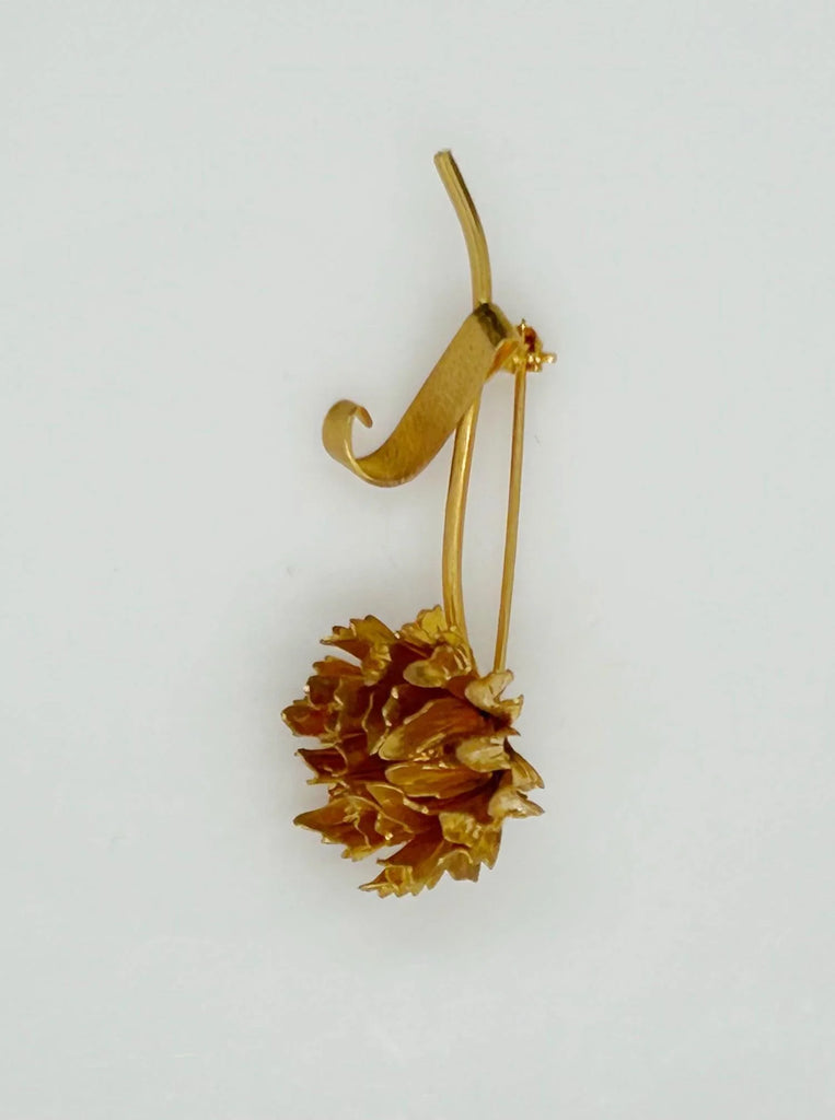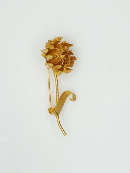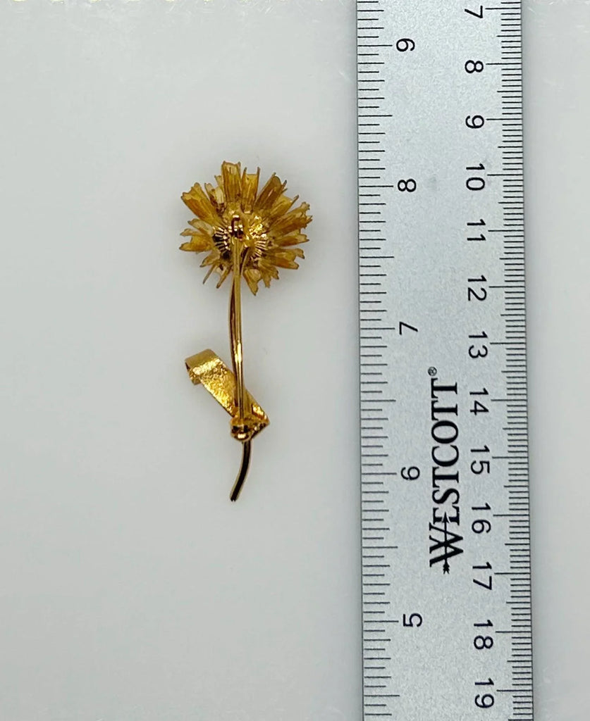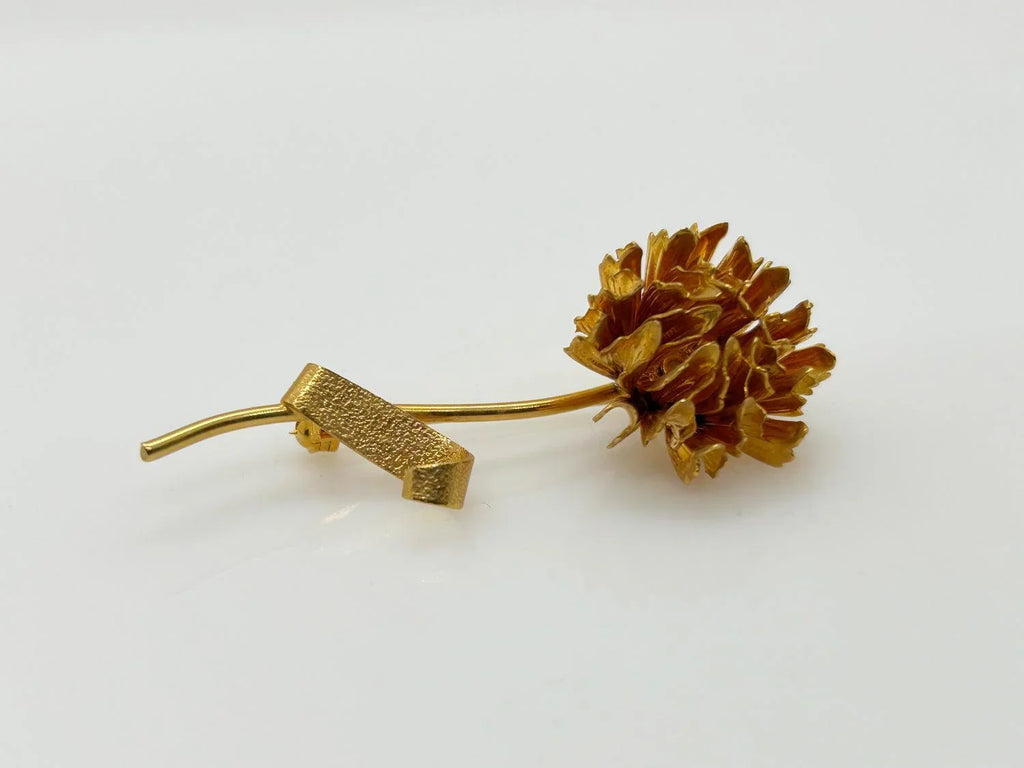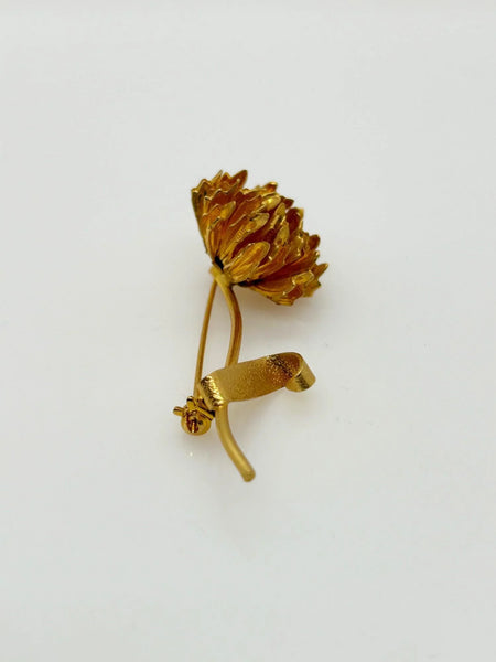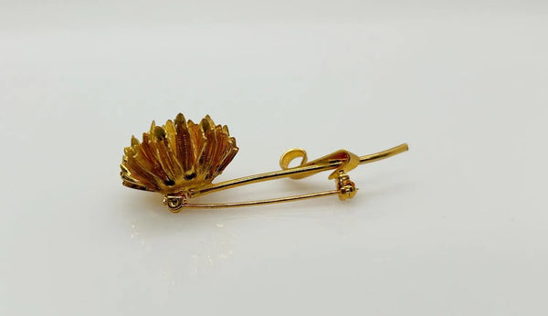 This vintage floral brooch is remarkably realistic, with its beautifully sculpted petals and they manner in which they curve in to the center. It rests on a stem and is accented with a curling textured leaf. It is 2.5" inches long and in excellent condition. Add a touch of elegance to any outfit with this intricately designed flower brooch.The delicate petals and lifelike curves bring a sense of beauty to your look, while the textured leaf adds a unique touch. Resting on a stem, this brooch is the perfect accessory for any occasion. Plus, in excellent condition, it's sure to be a lasting addition to your jewelry collection.