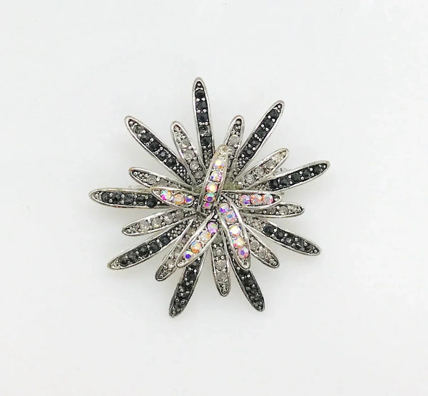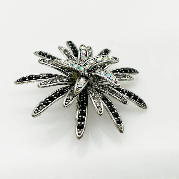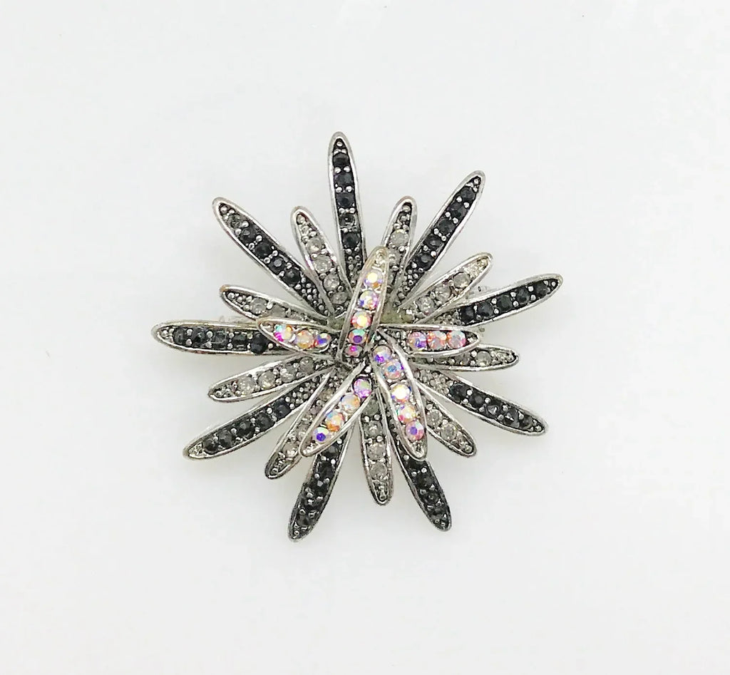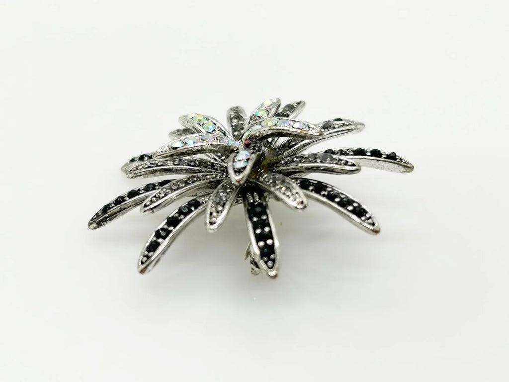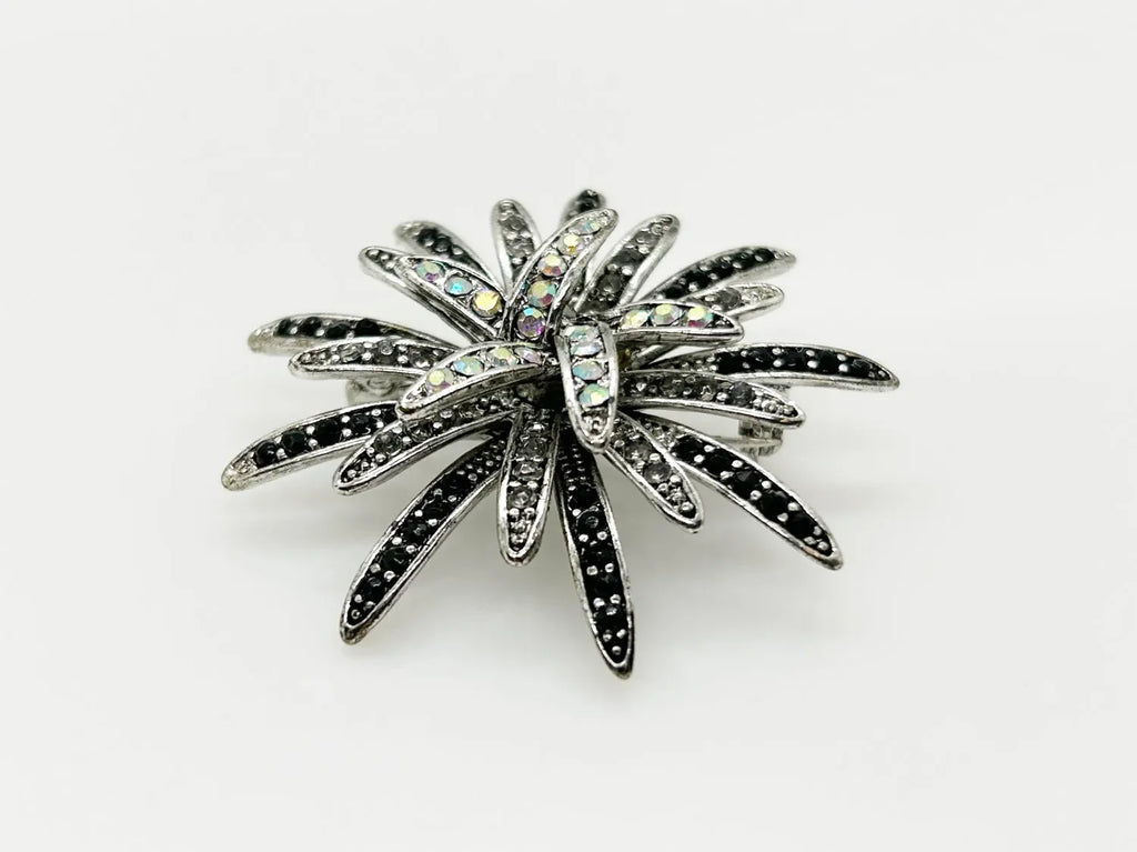 This striking vintage brooch reminds me of a chrysanthemum , it's gorgeous! Spikes of pave set faceted black stones are set along side spikes of white faceted stones and aurora borealis stones, in a domed silver tone setting. It measures 2" across and is in excellent condition.