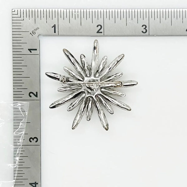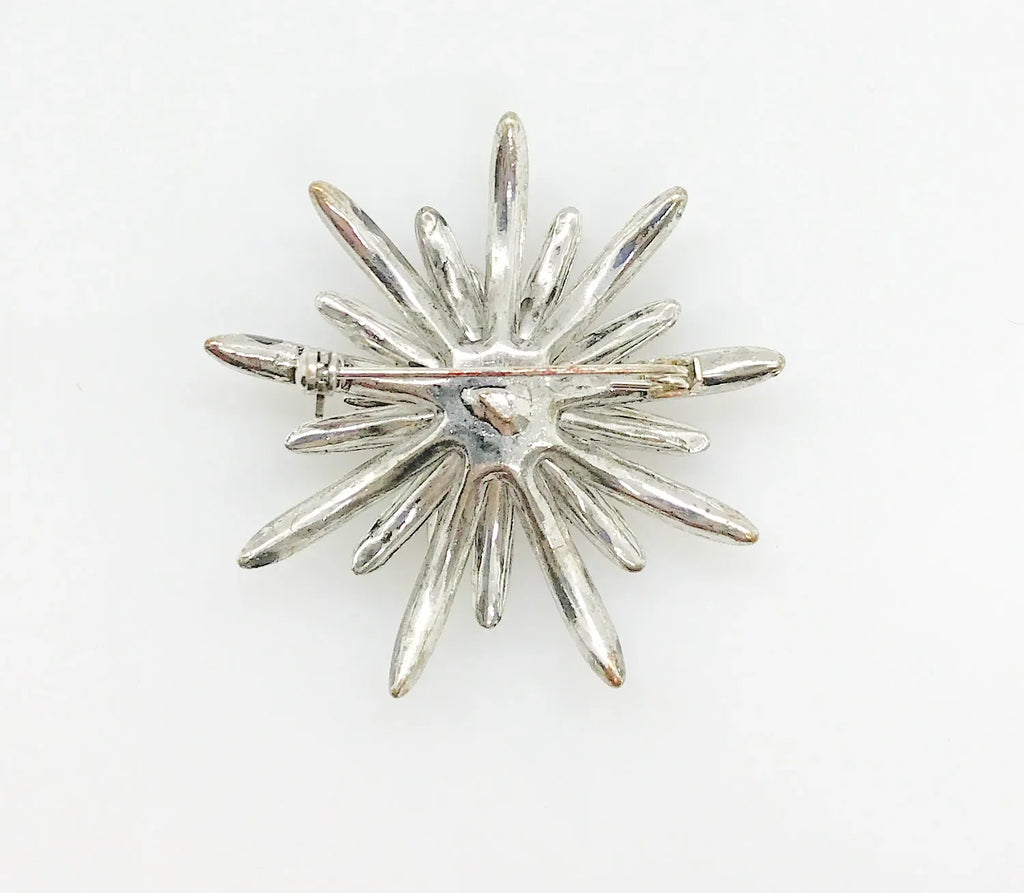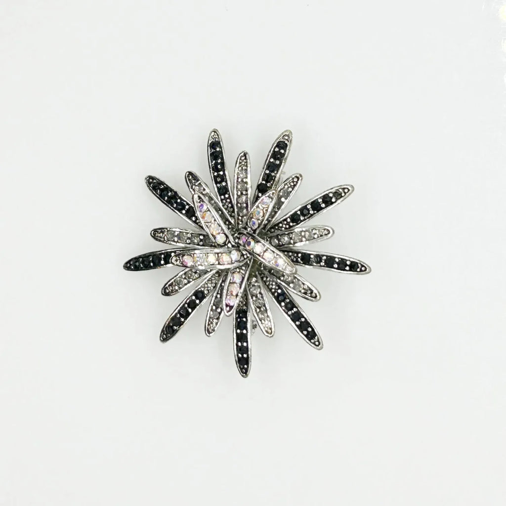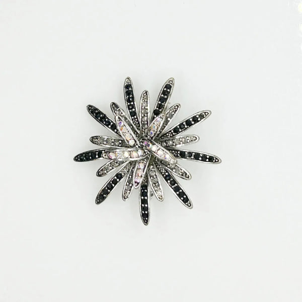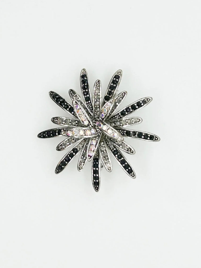 This striking vintage brooch reminds me of a chrysanthemum , it's gorgeous! Spikes of pave set faceted black stones are set along side spikes of white faceted stones and aurora borealis stones, in a domed silver tone setting. It measures 2" across and is in excellent condition.
