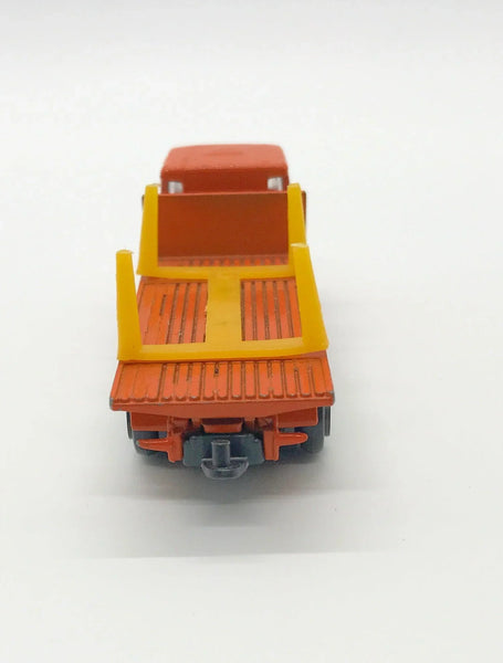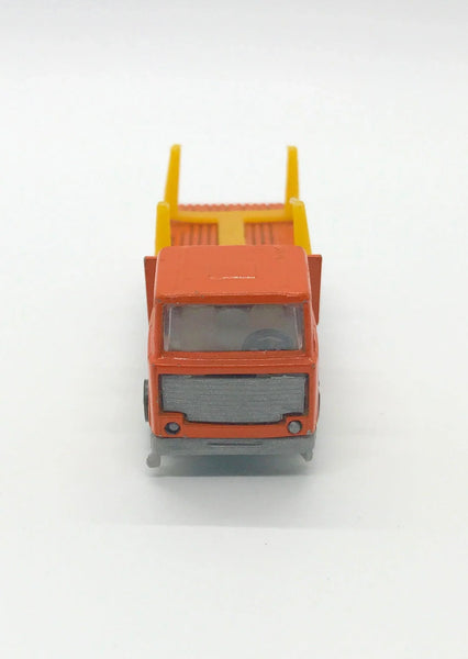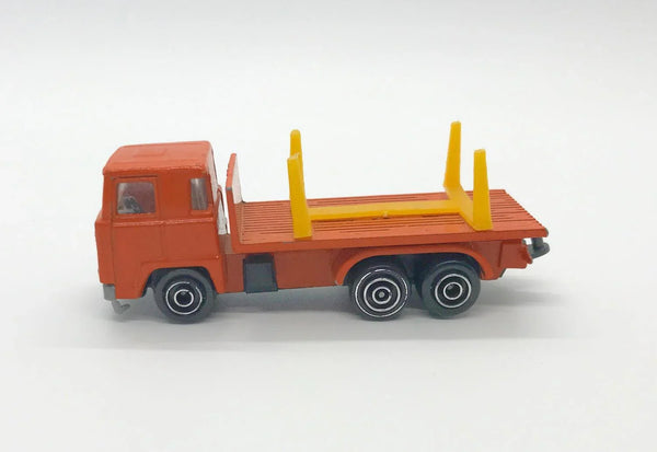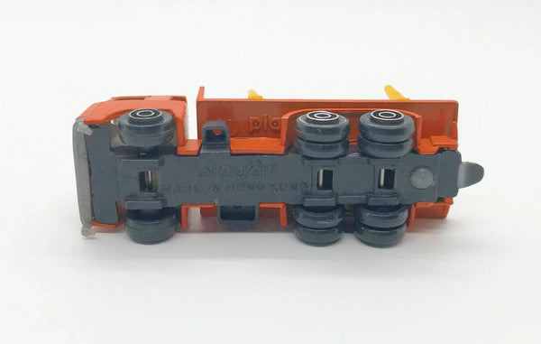 This is a metal, 1:64 scale truck, with orange body, yellow things to hold a container, clear windows and white interior. It was made in Hong Kong, which is where the company was based. Playart was the house brand for Woolworth's toy cars.