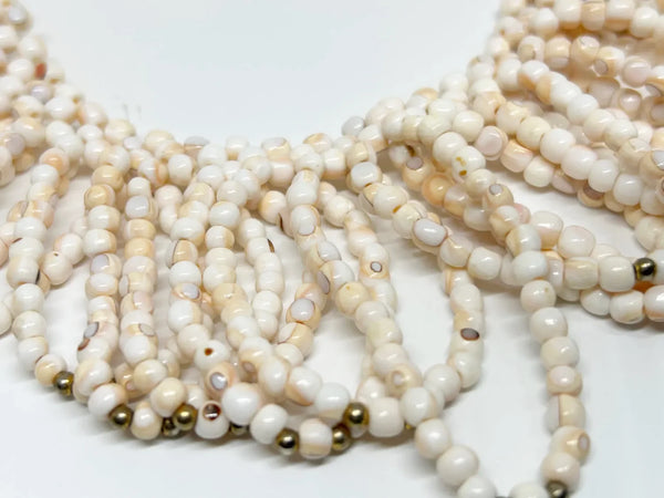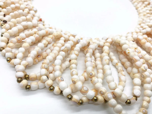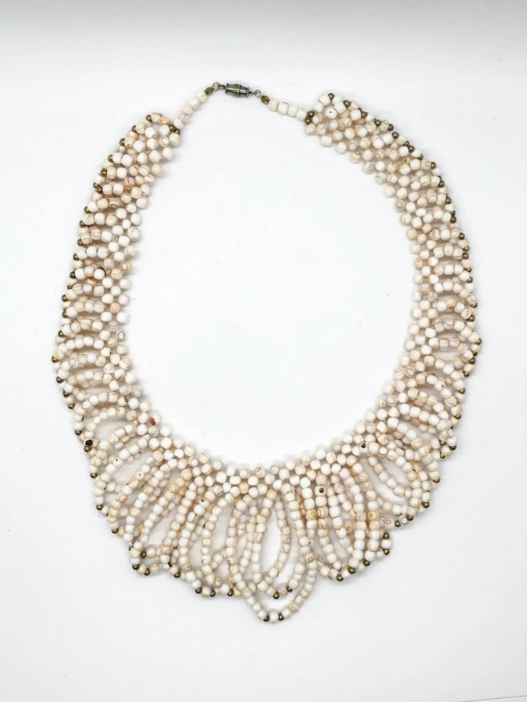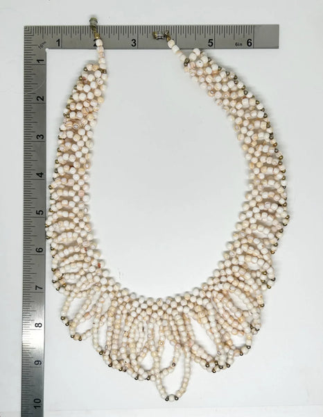 This elaborate vintage necklace showcases delicate loops of the softest light pink beads, beautifully accented with tiny gold beads that add a subtle shimmer. Secured with a classic barrel clasp, it measures 18" in length and gracefully drapes 3" at its longest point, creating a stunning layered effect. Despite its dramatic appearance, the necklace remains lightweight and comfortable to wear throughout the day or evening. Each bead is uniquely crafted, ensuring that your piece is truly one-of-a-kind. Elevate your style with this elegant accessory that effortlessly blends vintage charm with timeless sophistication.