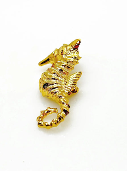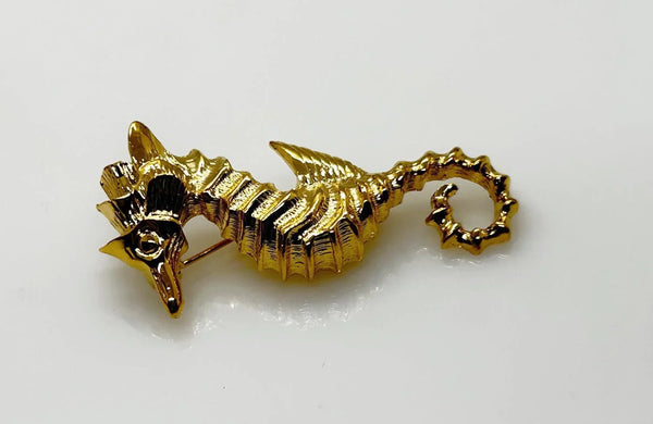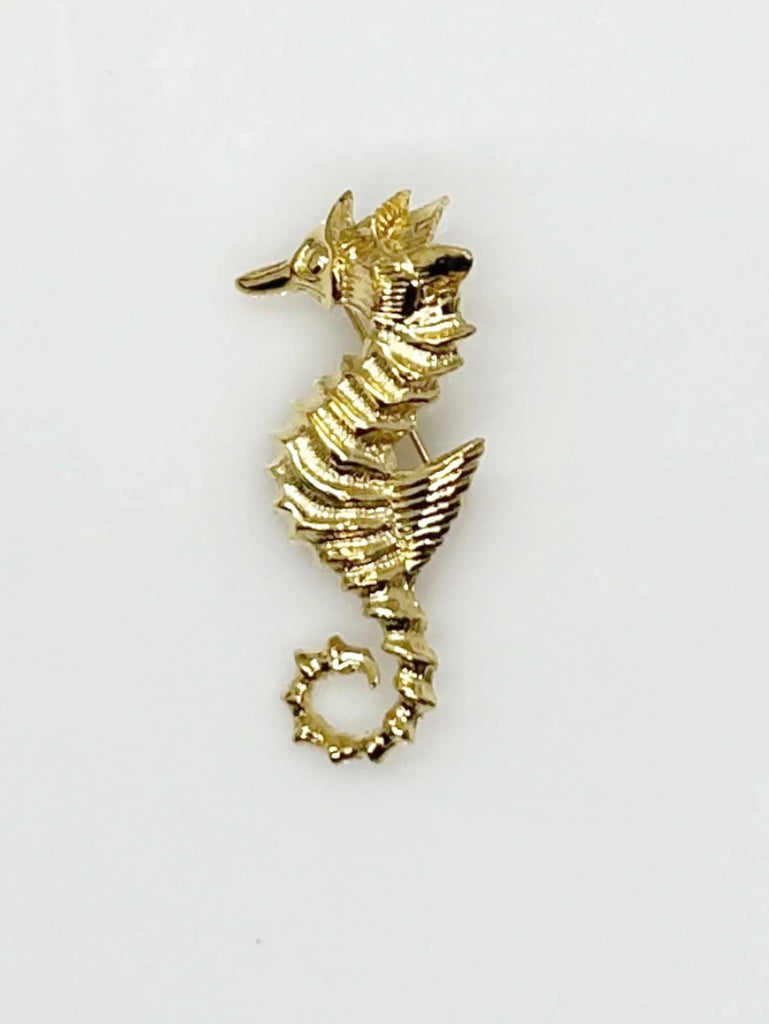 Add a touch of whimsy to your wardrobe with our exquisite vintage golden Sea horse Brooch! With exceptional detail and a size of less than 2", this charming accessory will surely make a statement. Perfect for any occasion, this brooch is in pristine condition and will add a touch of individuality to any outfit.