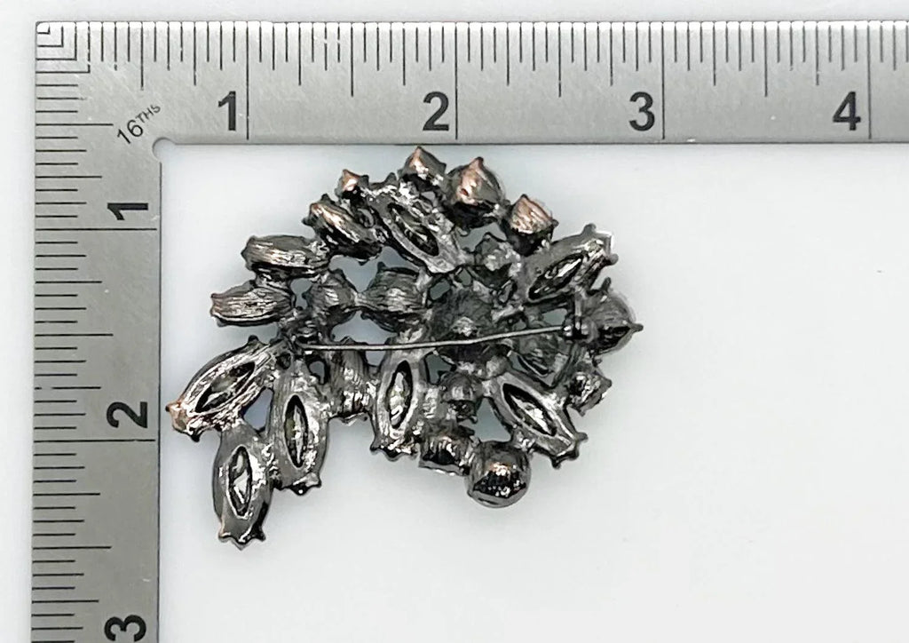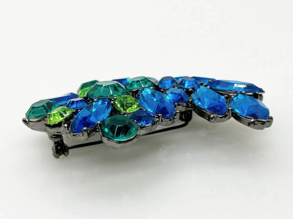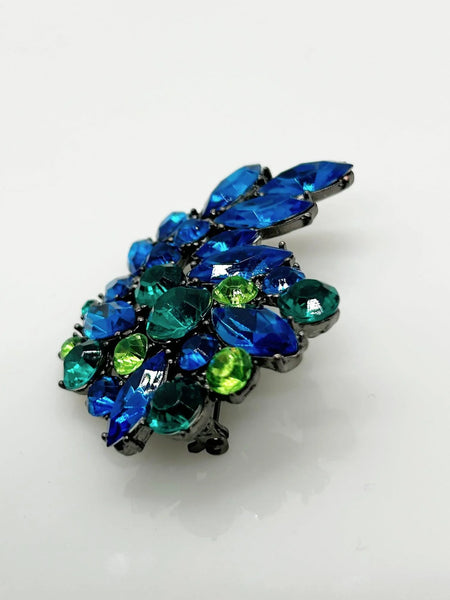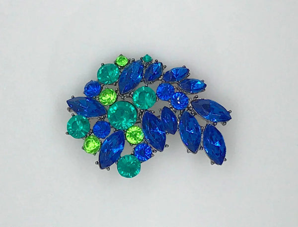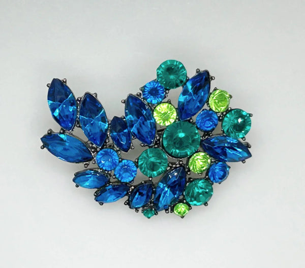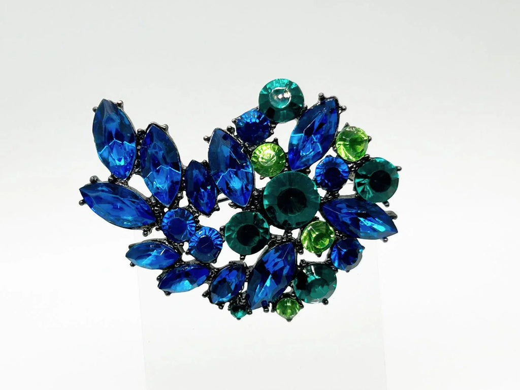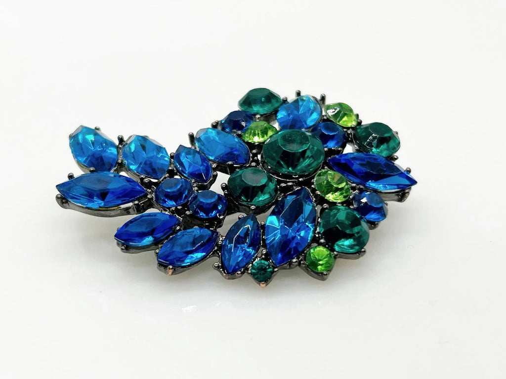 Bring a touch of timeless elegance to your wardrobe with this stunning Vivid Vintage Blue, Aqua and Green Stones Brooch in Blackened Metal! The intricate design showcases a beautiful blend of rich blue, medium blue green, deep green and bright lime green stones, all set in a captivating dark metal. The unique combination of marquise and round shapes add depth and dimension to this eye-catching accessory. At 2.5" long, it's the perfect size to make a statement - whether you're dressing up for a special occasion or simply adding a pop of color to your everyday look. Don't miss out on this must-have addition to your jewelry collection - order now and elevate any outfit with a touch of vintage charm!