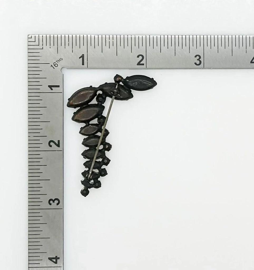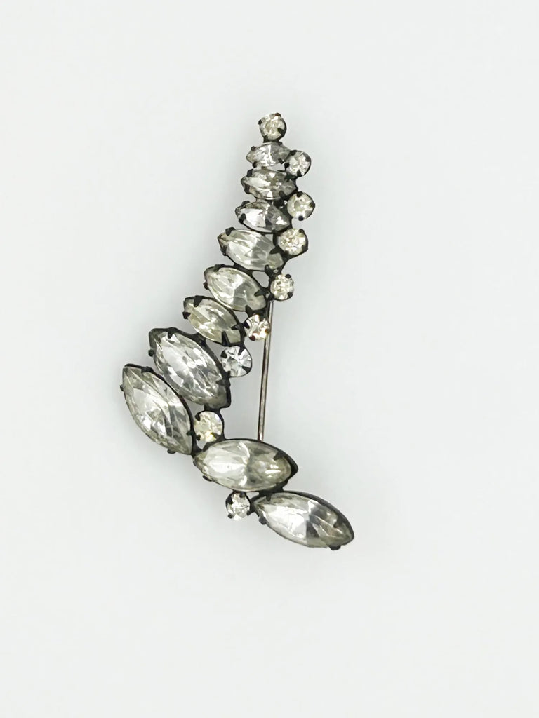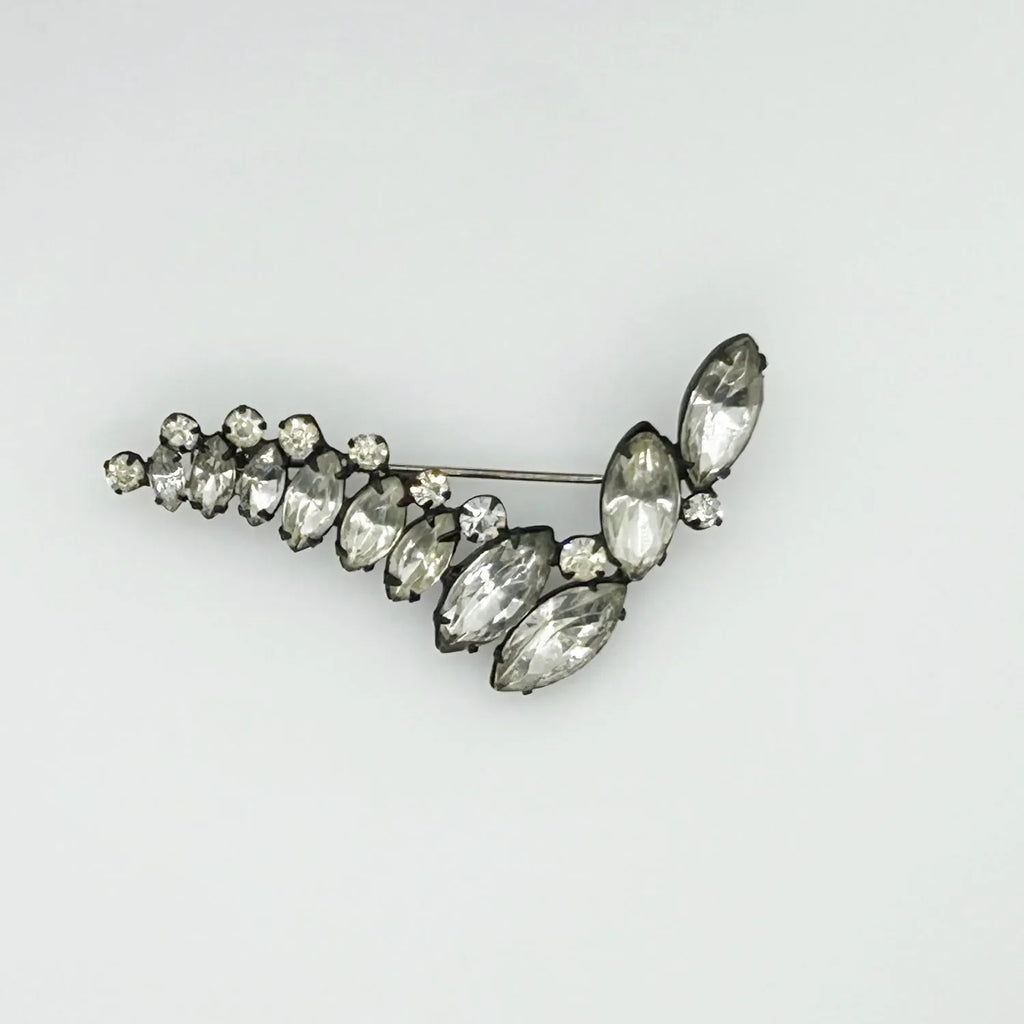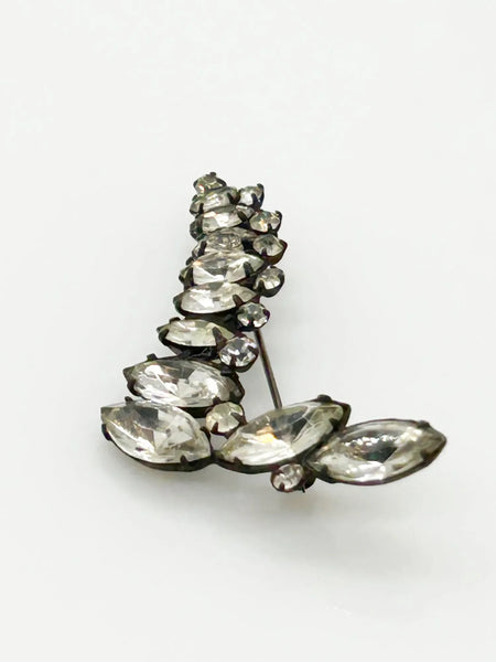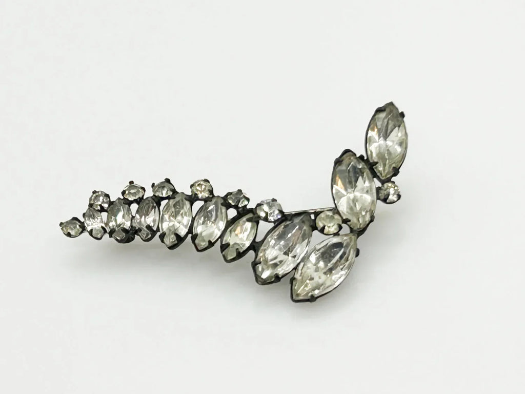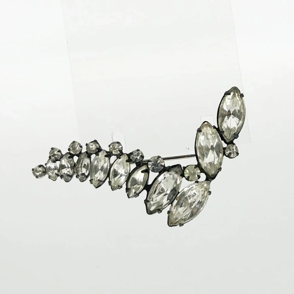 This is a striking vintage pin made of black metal in a wave design set with large marquise and small round white rhinestones. It measures 2 3/4" across and is in very good condition.
