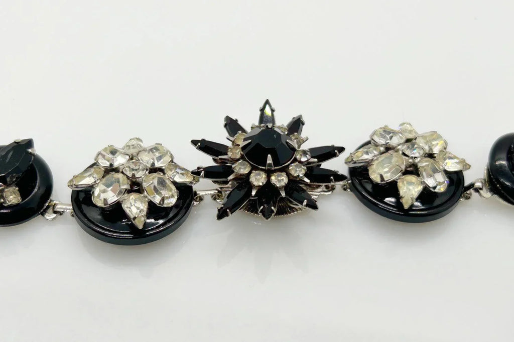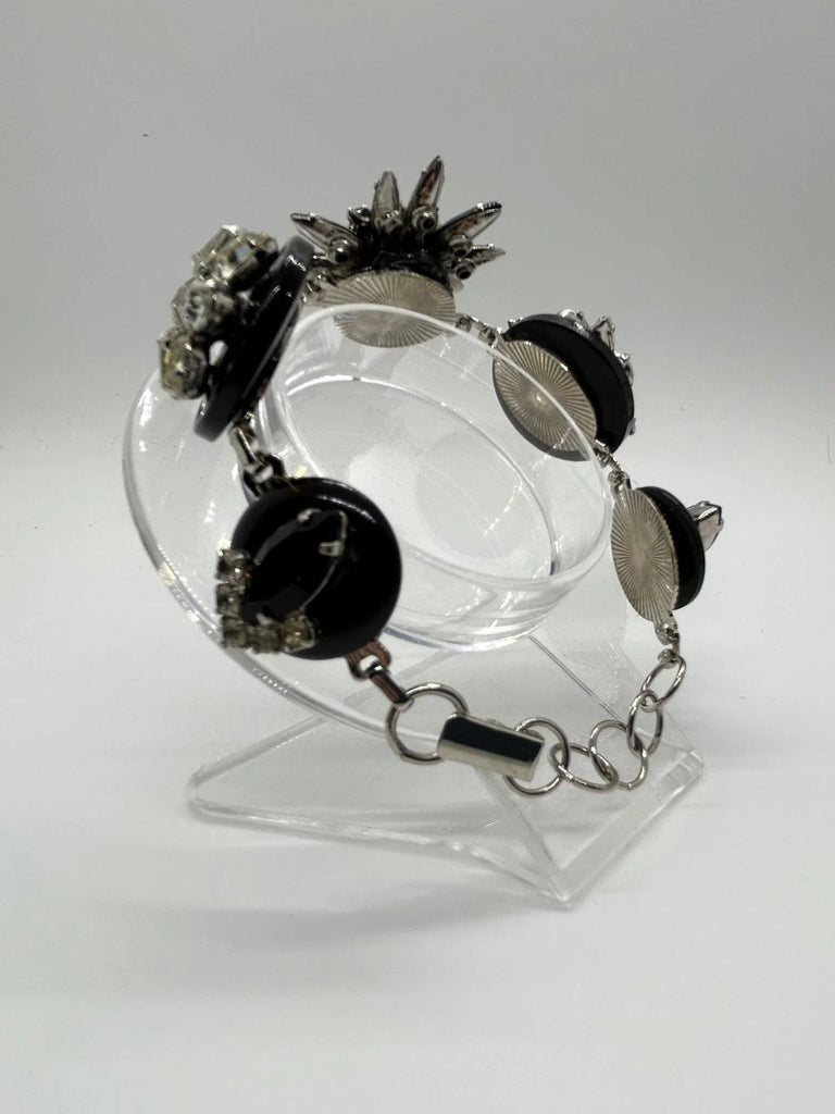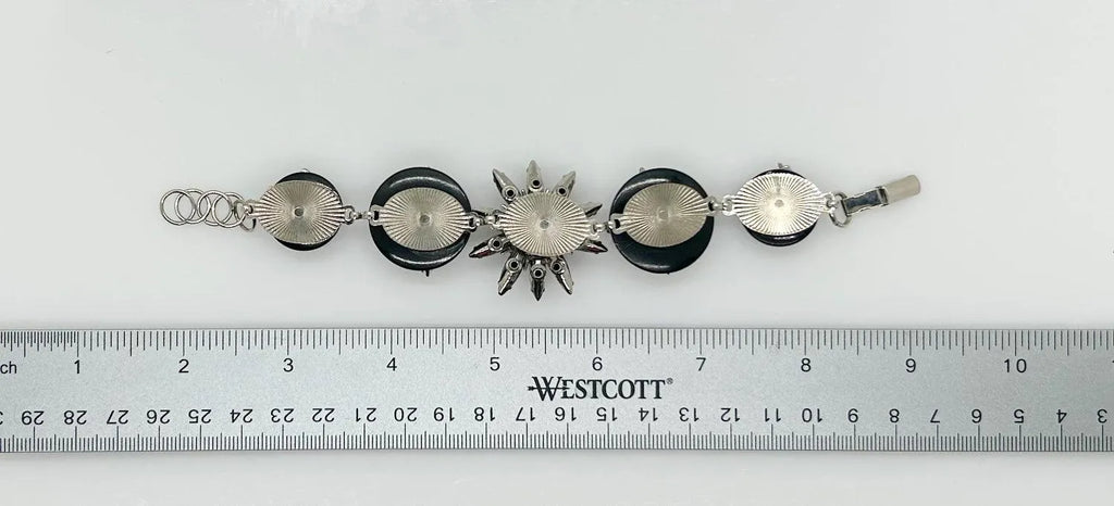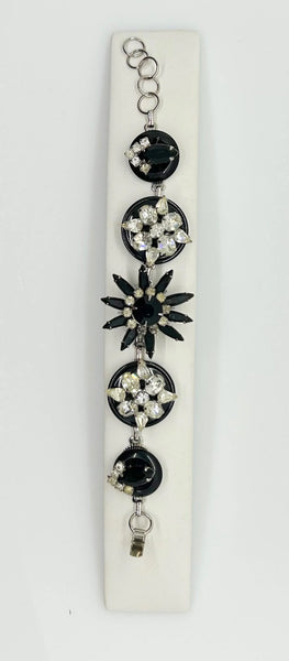 This exquisite vintage bracelet boasts five elements: two small rounded black discs with a marquise black stone and 5 clear rhinestones, as well as two larger round black discs with nine clear rhinestones in oval, teardrop, and round shapes. The center features a beautiful flower shape made of black and white stones. The bracelet is secured with a fold over clasp and is adorned with stunning silver textured patterns on the back of each disc.It measures about 7" and can be worn shorter.