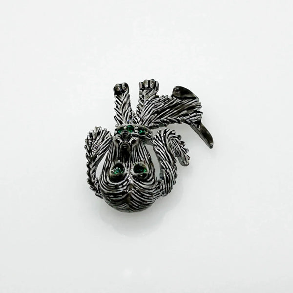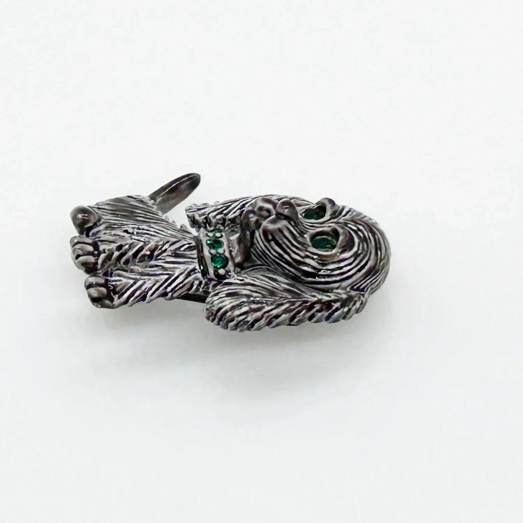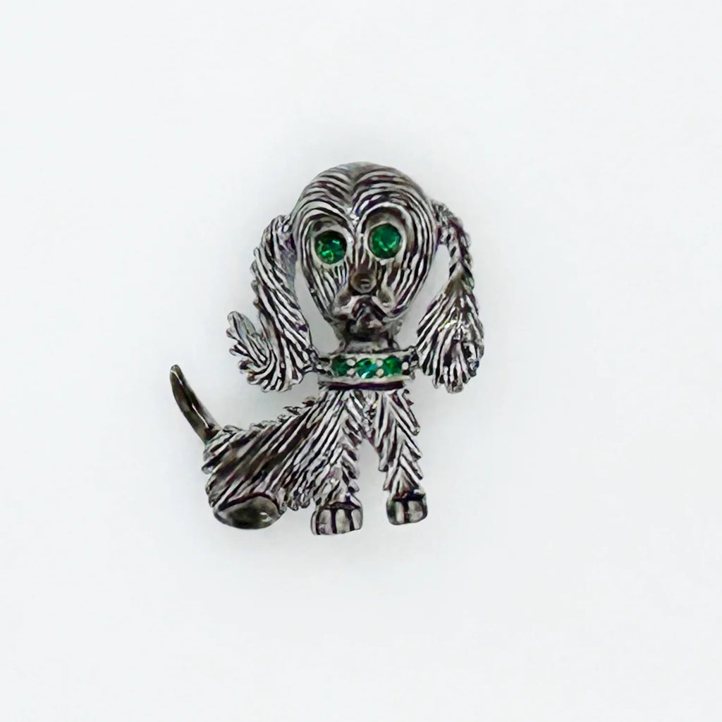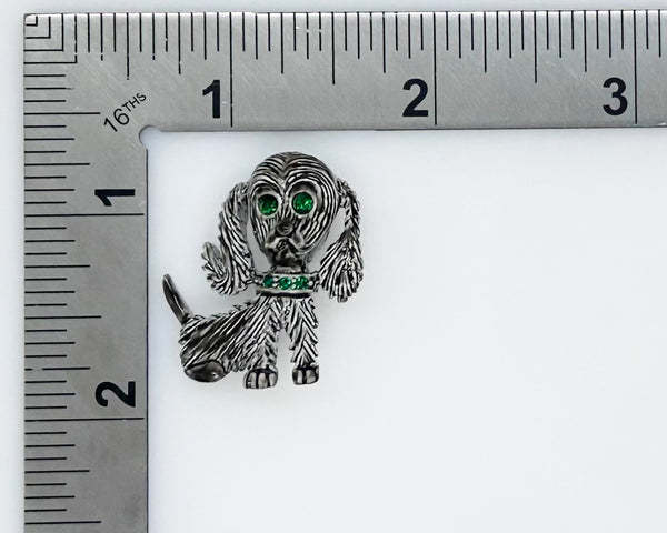 This vintage Gerry's brooch shows an adorable, floppy eared puppy dog. He has bright green eyes and collar and wagging tail. He's just waiting for you! His coat is well detailed in silver tone metal. He or she measures 1 3/4" tall and is marked "Gerry's" in capitals on the white enamel back.