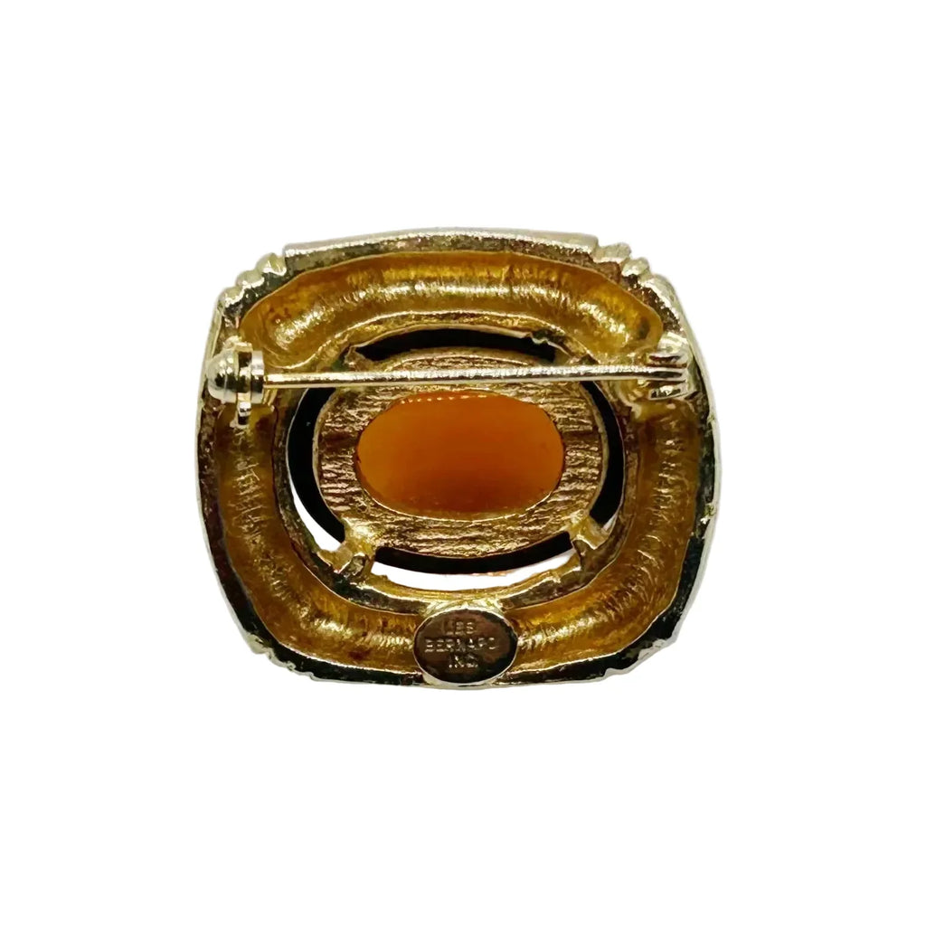 Indulge in the warm, honeyed glow of this delightful Les Bernard brooch. Rich amber glass catches the light like liquid caramel, nestled within a brushed gold-tone squared setting that frames it to perfection. Measuring 1 1/4" across, this signed vintage piece evokes the sweetness of butterscotch and the sophistication of fine spirits. A charming accessory from the legendary designer duo who launched Les Bernard Inc. in 1963, this brooch brings vintage glamour and a touch of nostalgic warmth to any ensemble.
