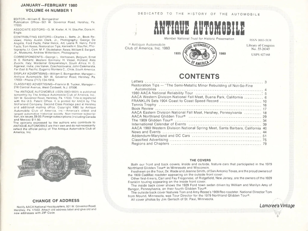 This is the January- February issue of the magazine of Antique Automobile afficiandos. Front cover 1909 Cadillac Roadster, inside front cover 1929 Franklin Touring; inside front cover 1929 Ford Town Sedan, 1909 Reo Roadster. These were all cars who participated in the 1979 Northland Glidden Tour